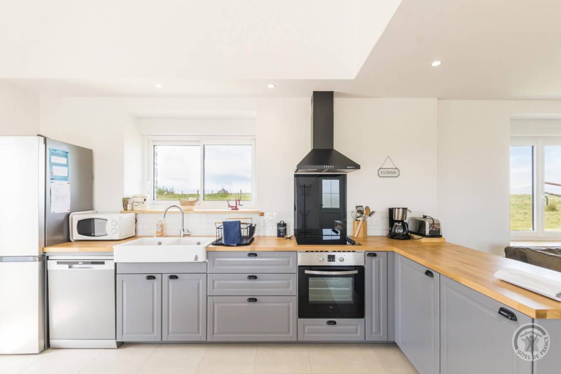 Freistehendes Haus. Küche (Filterkaffeemaschine, Backofen, Geschirrspüler, Cerankochfeld, Kühlschrank mit Gefrierfach, Mikrowelle) mit Zugang zum Wohnzimmer (TV, WLAN). Schlafzimmer 1 (Queensize-Bett). Badezimmer mit Waschmaschine. WC. Im Obergeschoss: Schlafzimmer 2: zwei Einzelbetten (90 x 190 cm) (kein Fenster nach außen, aber ein kleines Fenster zum Flur und eine Glastrennwand zum Wohnzimmer), Schlafzimmer 3 (Queensize-Bett) mit eigenem Duschbad und Blick auf den Mont Saint-Michel. WC. Bettwäsche, Handtücher und Haushaltswäsche werden gestellt. Die Betten sind bei Ankunft bezogen. Endreinigung inklusive. Elektrische Heizung inklusive. Gartenmöbel. Picknicktisch. Grill. Parkplatz. Privater, umzäunter Garten. Für Anreisen nach 18:00 Uhr steht ein Schlüsselsafe zur Verfügung. Dieses Ferienhaus ist nicht für Personen mit eingeschränkter Mobilität geeignet. Blick auf den Mont Saint-Michel vom Erdgeschoss aus, abhängig von der Jahreszeit und den Feldfrüchten auf dem Nachbarfeld.