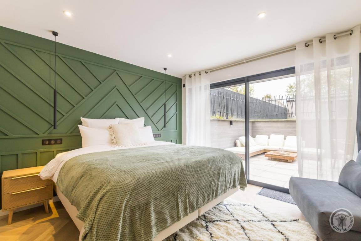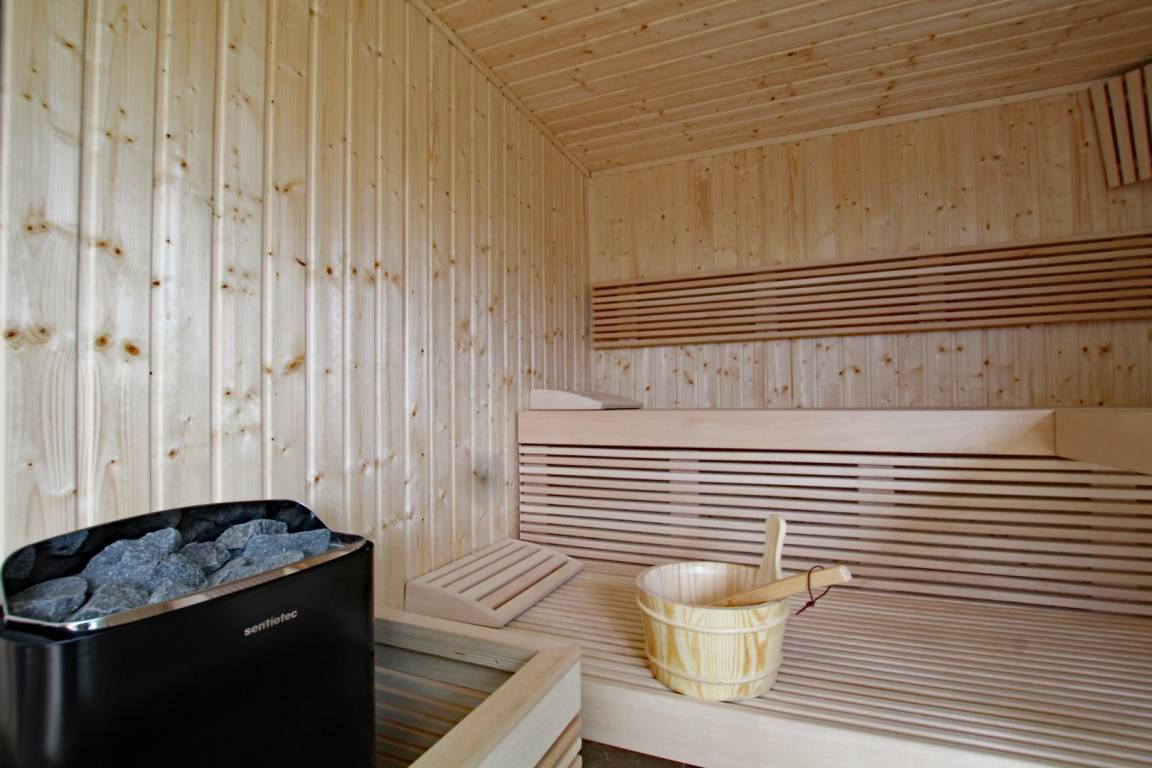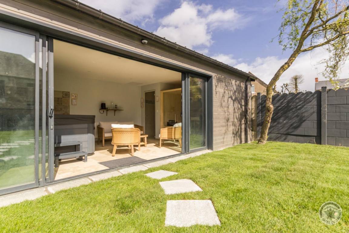 Freistehendes Haus, erreichbar über eine Treppe über wenige Stufen. Großes Wohnzimmer (Breitbildfernseher, Internet, Smart Speaker) mit voll ausgestatteter, zum Wohnzimmer offener Küche (Backofen, Induktionskochfeld, Mikrowelle, Geschirrspüler, Kühl-/Gefrierschrank, Küchenmaschine). Abstellraum mit separater Toilette. Auf der unteren Ebene: Schlafzimmer 1 (1 Bett 180 x 200, Fernseher) mit Zugang zur Terrasse, Schlafzimmer 2 (1 Bett 180 x 200, Fernseher) mit Zugang zur Terrasse, Badezimmer mit geräumiger Badewanne, große Doppeldusche. Separate Toilette. Waschküche (Waschmaschine, Trockner). Zustellbett in jedem Schlafzimmer. Babyausstattung auf Anfrage. Umkehrbare Wärmepumpenheizung (Klimaanlage) inklusive. Bettwäsche und Handtücher werden gestellt. Betten bei Ankunft bezogen. Reinigungsservice gegen Aufpreis. Privater umzäunter Garten. Gartenmöbel. Grill. Privater Anbau mit Ruhebereich: Sauna, Hamam, Spa und Duschraum. Privater Parkplatz. Ladestation für Elektroautos gegen Aufpreis.