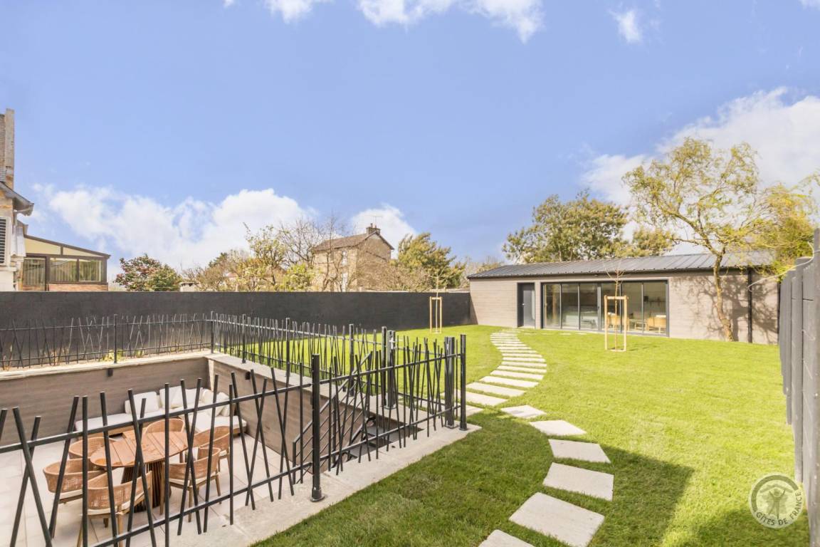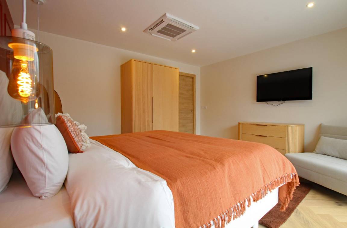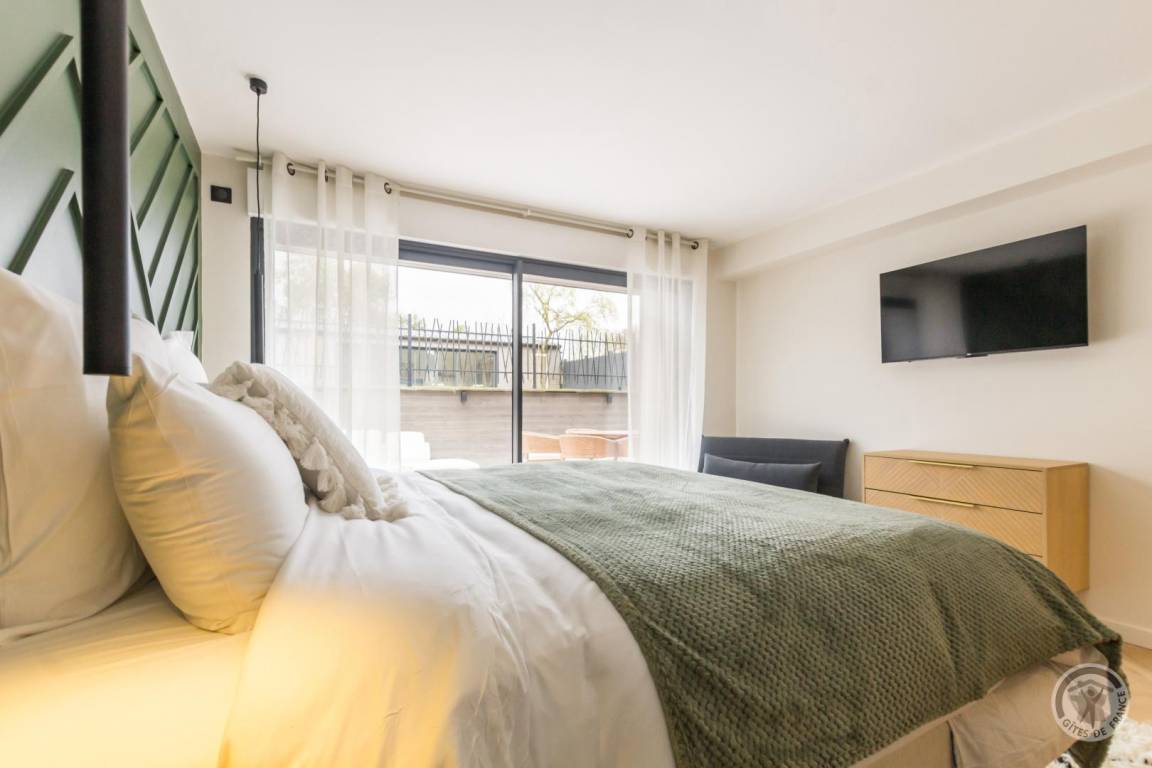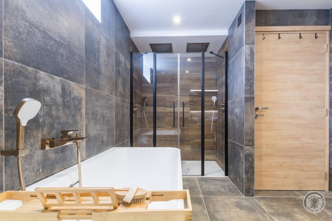 Freistehendes Haus, erreichbar über eine Treppe über wenige Stufen. Großes Wohnzimmer (Breitbildfernseher, Internet, Smart Speaker) mit voll ausgestatteter, zum Wohnzimmer offener Küche (Backofen, Induktionskochfeld, Mikrowelle, Geschirrspüler, Kühl-/Gefrierschrank, Küchenmaschine). Abstellraum mit separater Toilette. Auf der unteren Ebene: Schlafzimmer 1 (1 Bett 180 x 200, Fernseher) mit Zugang zur Terrasse, Schlafzimmer 2 (1 Bett 180 x 200, Fernseher) mit Zugang zur Terrasse, Badezimmer mit geräumiger Badewanne, große Doppeldusche. Separate Toilette. Waschküche (Waschmaschine, Trockner). Zustellbett in jedem Schlafzimmer. Babyausstattung auf Anfrage. Umkehrbare Wärmepumpenheizung (Klimaanlage) inklusive. Bettwäsche und Handtücher werden gestellt. Betten bei Ankunft bezogen. Reinigungsservice gegen Aufpreis. Privater umzäunter Garten. Gartenmöbel. Grill. Privater Anbau mit Ruhebereich: Sauna, Hamam, Spa und Duschraum. Privater Parkplatz. Ladestation für Elektroautos gegen Aufpreis.