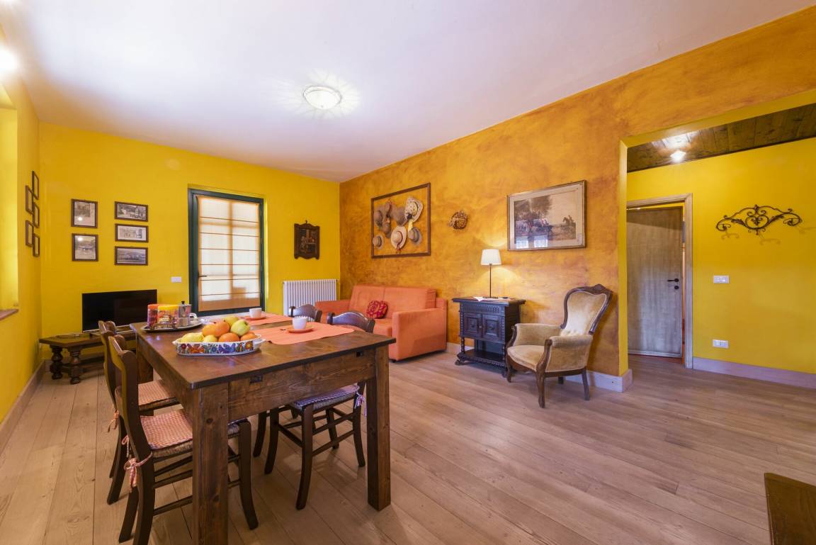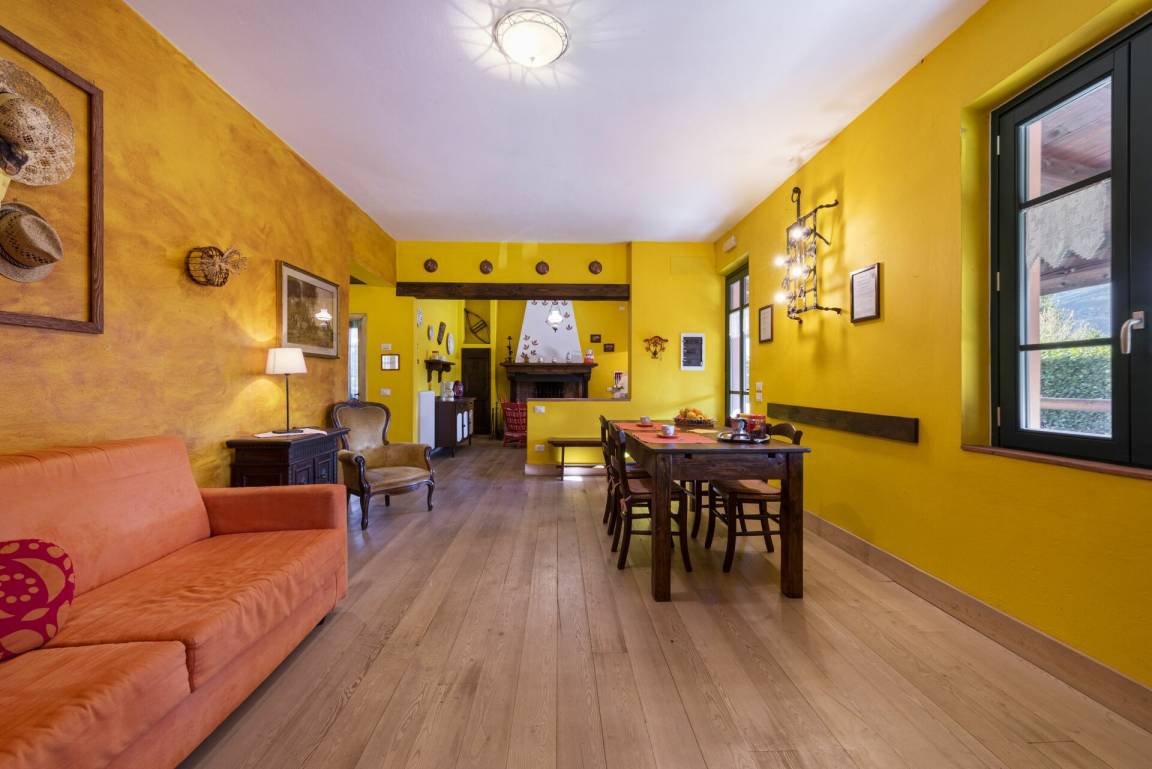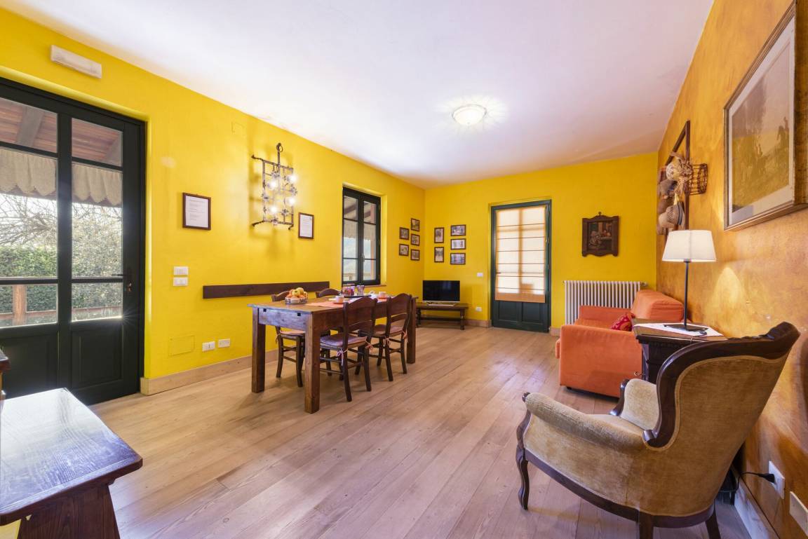 Wohnzimmer: Sofa, Sessel, Esstisch (Personen: 6), Internet, TV, Ausgang auf den Garten.
