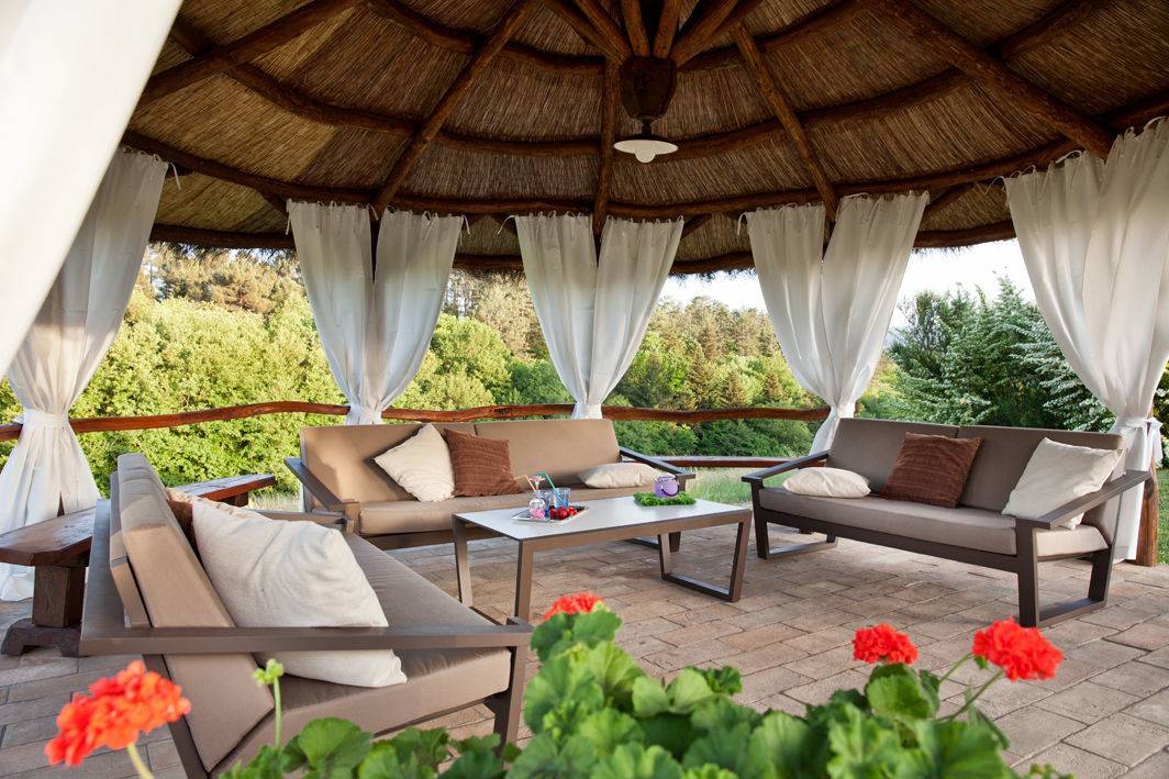 Panoramaterrasse mit Tischen ausgestattet
