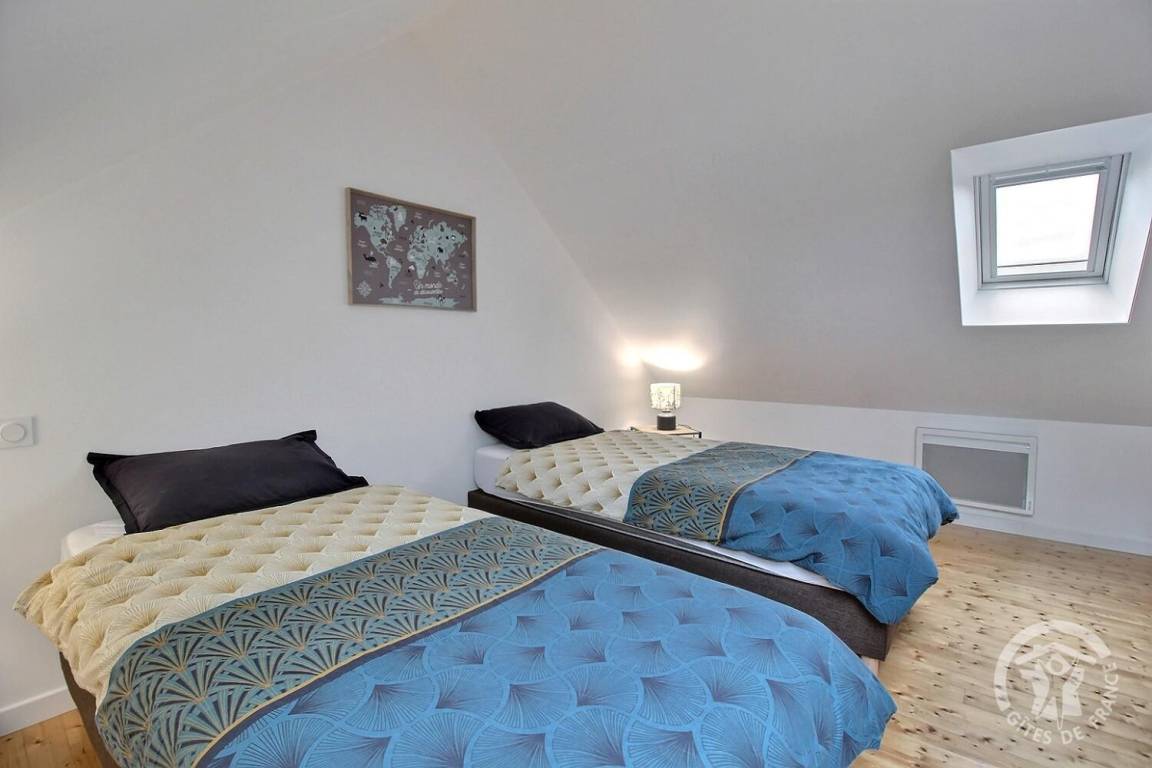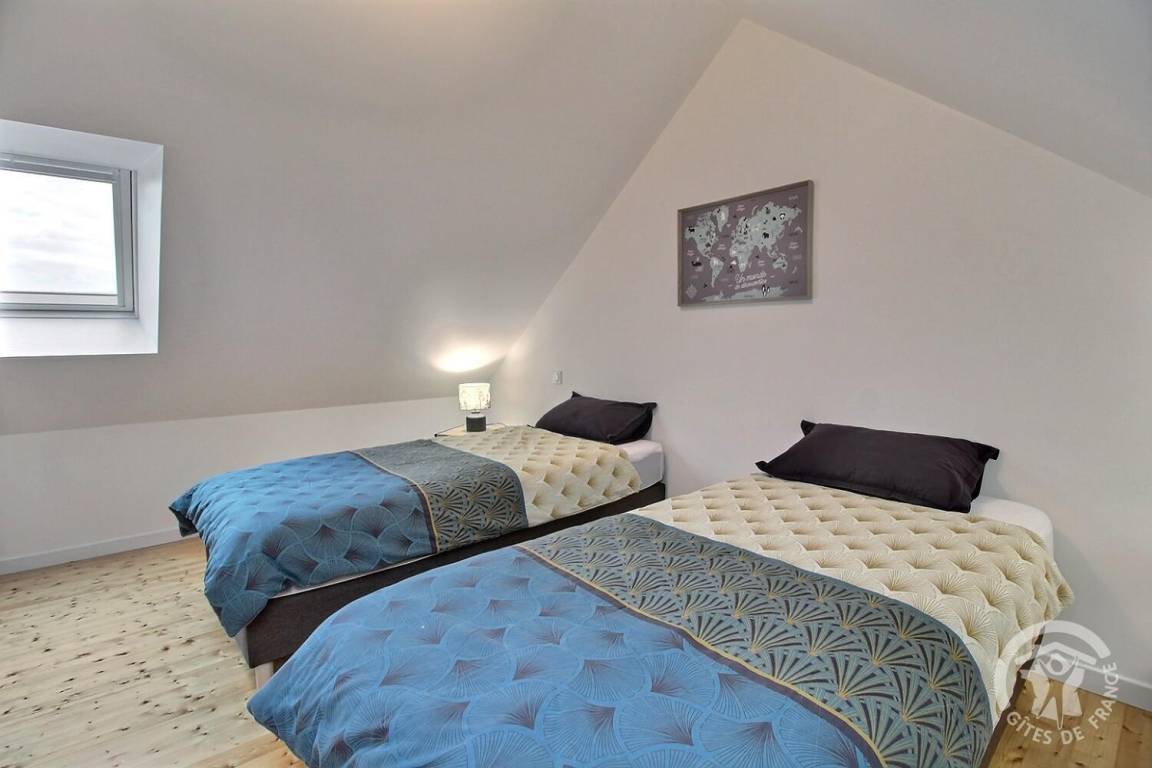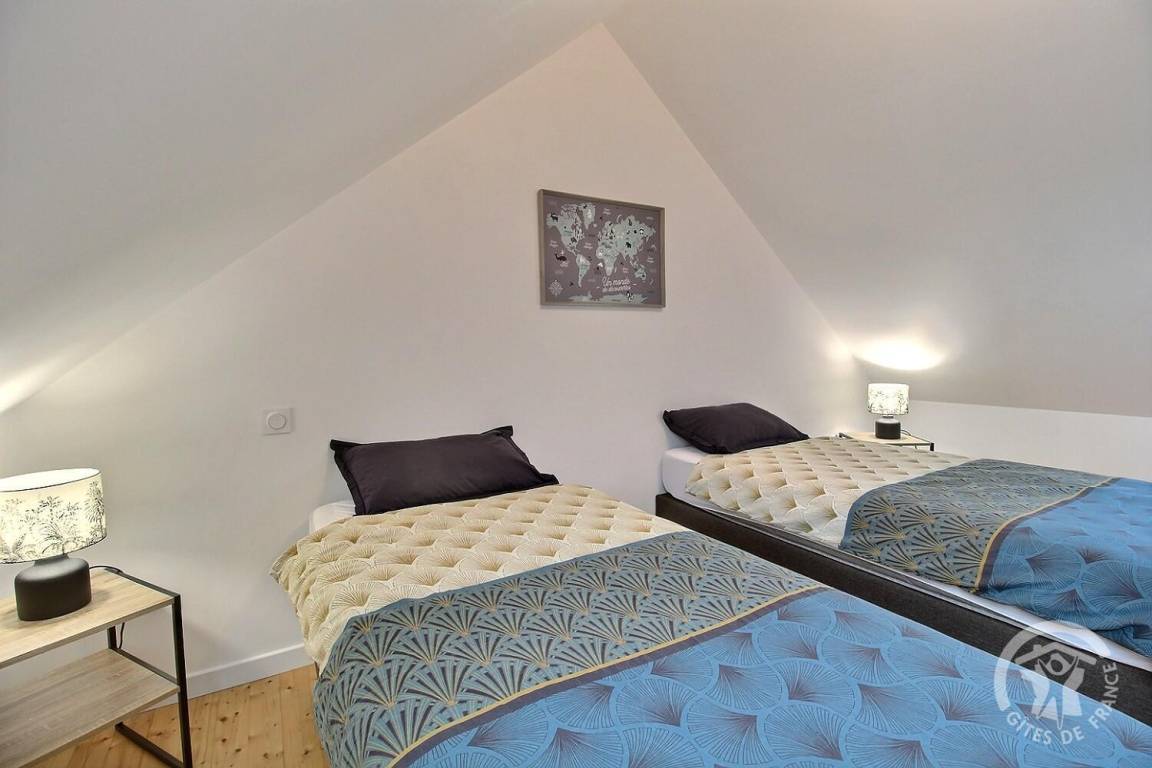 2. Obergeschoss: Ein Schlafzimmer mit zwei Einzelbetten 90x200 cm, die zu einem Doppelbett 180x200 cm zusammengestellt werden können.