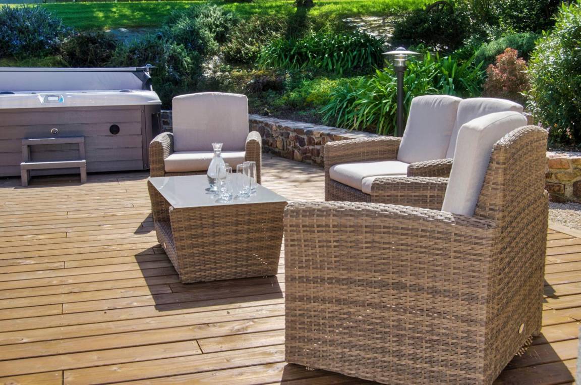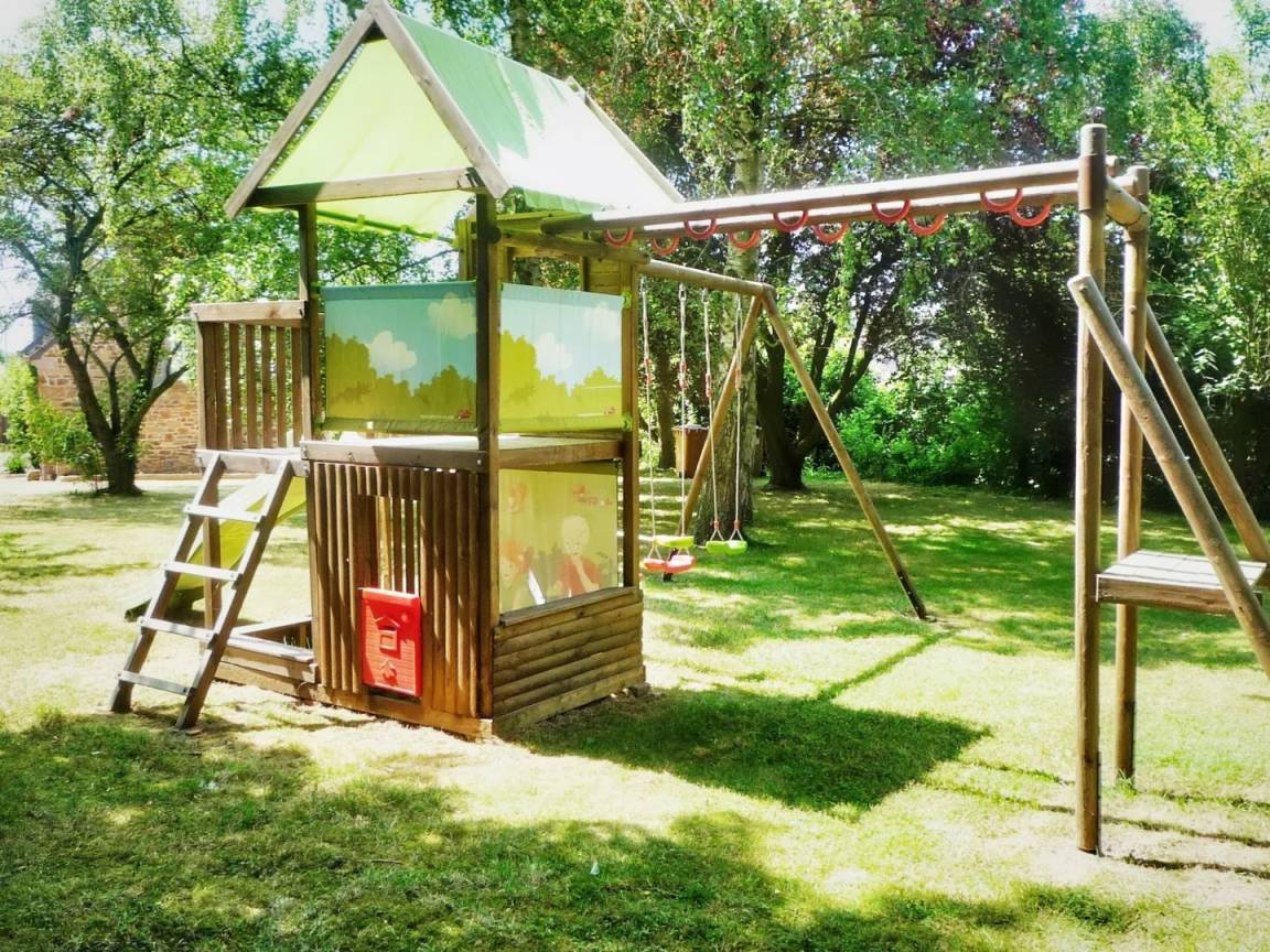 Draußen: großes Waldgrundstück von 3000 m², Gartentisch und -möbel, Grill, Sonnenliege, Spielbereich für die größte Freude der Kinder (Hütte, Rutsche, Schaukel usw.), Spa für 6 Personen auf einer schönen Holzterrasse.