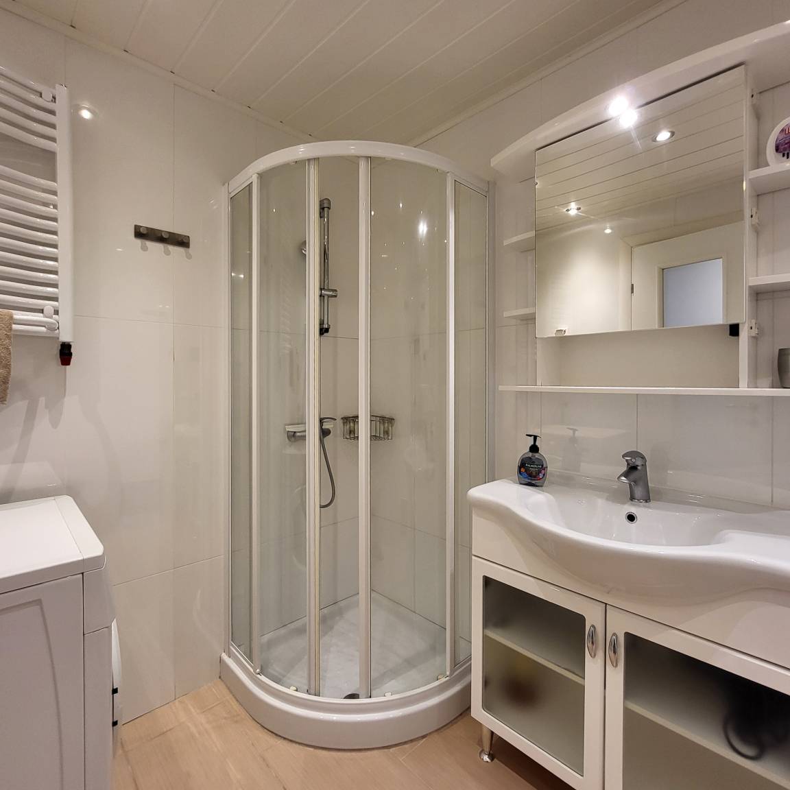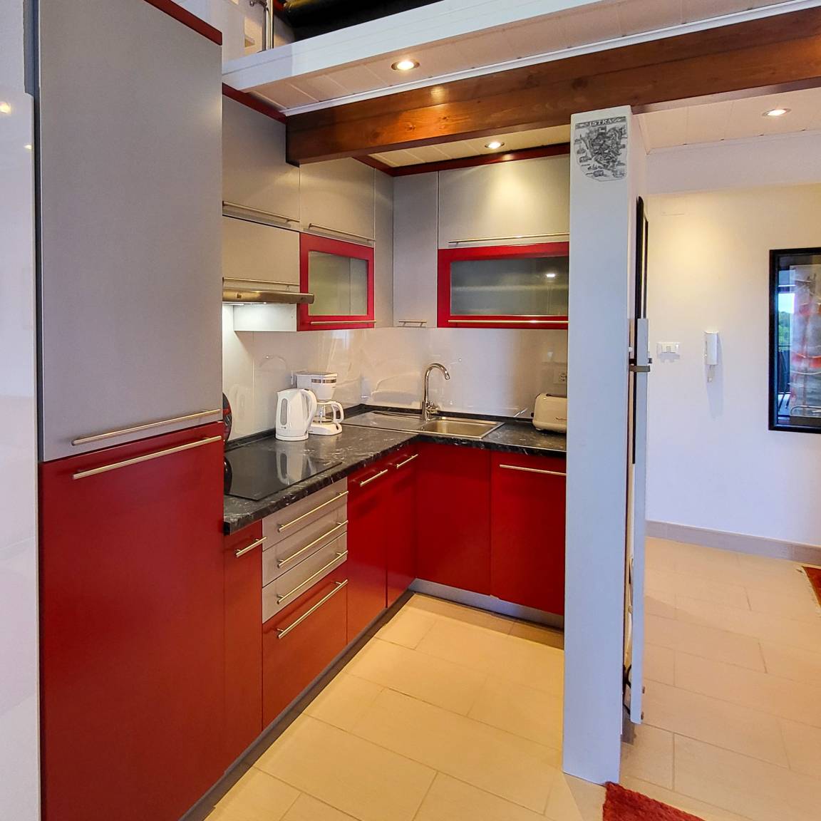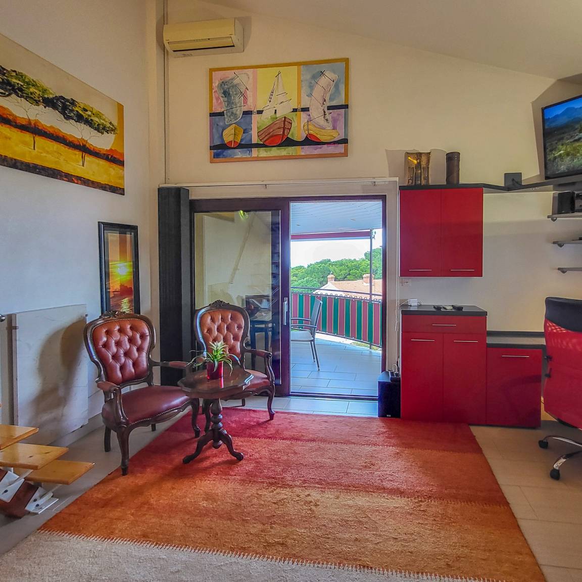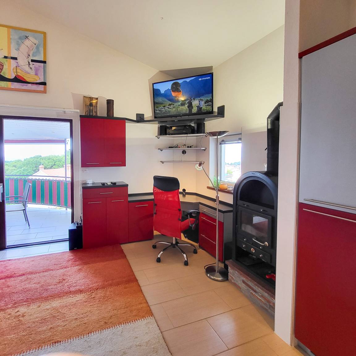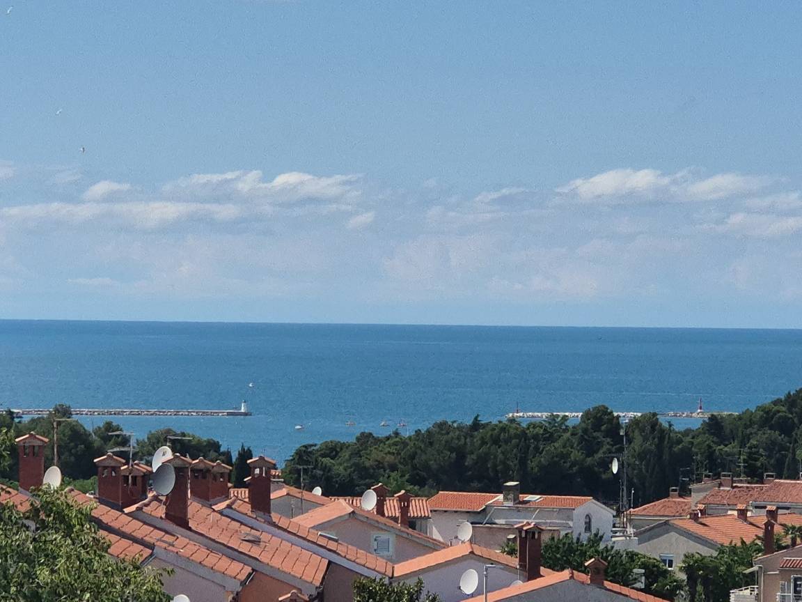 Im Bad mit Dusche und Toilette befindet sich auch die Waschmaschine. Im Wohnbereich befindet sich das Sat-TV sowie der Essbereich für 2 Personen. Direkter Ausgang auch zum Balkon mit wunderschönem Panoramameerblick. Sie schauen auf die nördliche Hafenausfahrt und Altstadt von Porec sowie die vorgelagerte Insel Sv. Nikola.