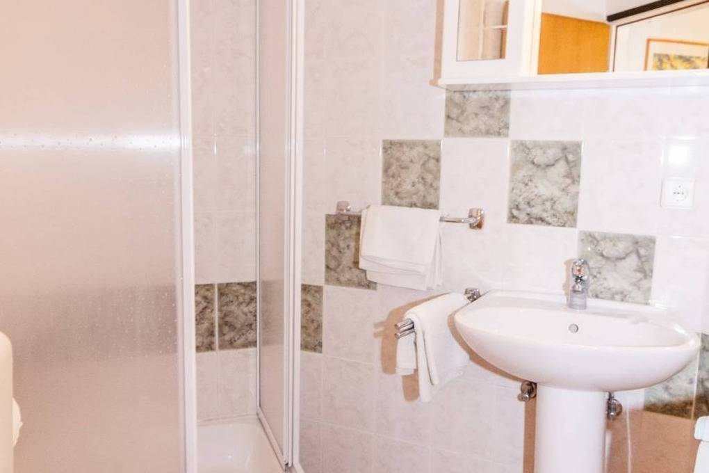 Im Bad mit Dusche und Toilette befindet sich auch die Waschmaschine. Im Wohnbereich befindet sich das Sat-TV sowie der Eßbereich für 4 Personen. direkter Ausgang auch zur Terrasse.