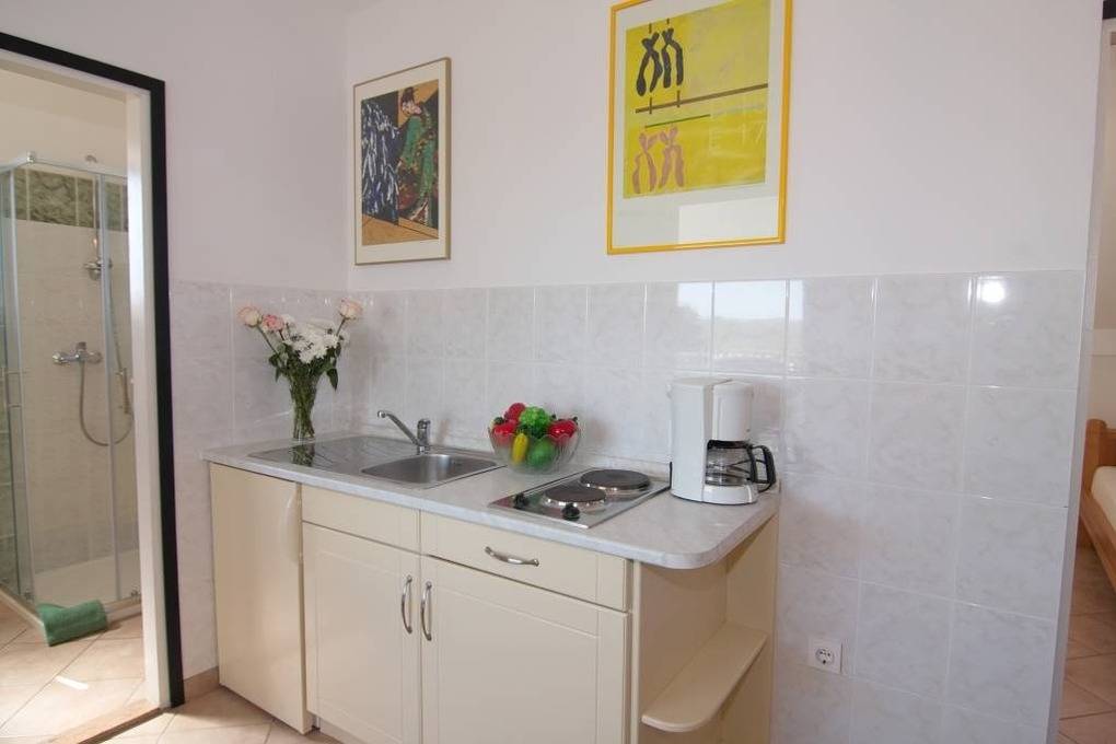 In den Schränken der Küche finden Sie ausreichend Platz für Stauraum und die Küchenkomplettausstattung. Ein 4-Platten-Herd und Backofen, Dunstabzugshaube, zwei Kühlschränke mit Eisfach, Kaffeemaschine, Mikrowelle, Spülmaschine, Elektrogrill, Wasserkocher sowie Staubsauger runden das Angebot ab.