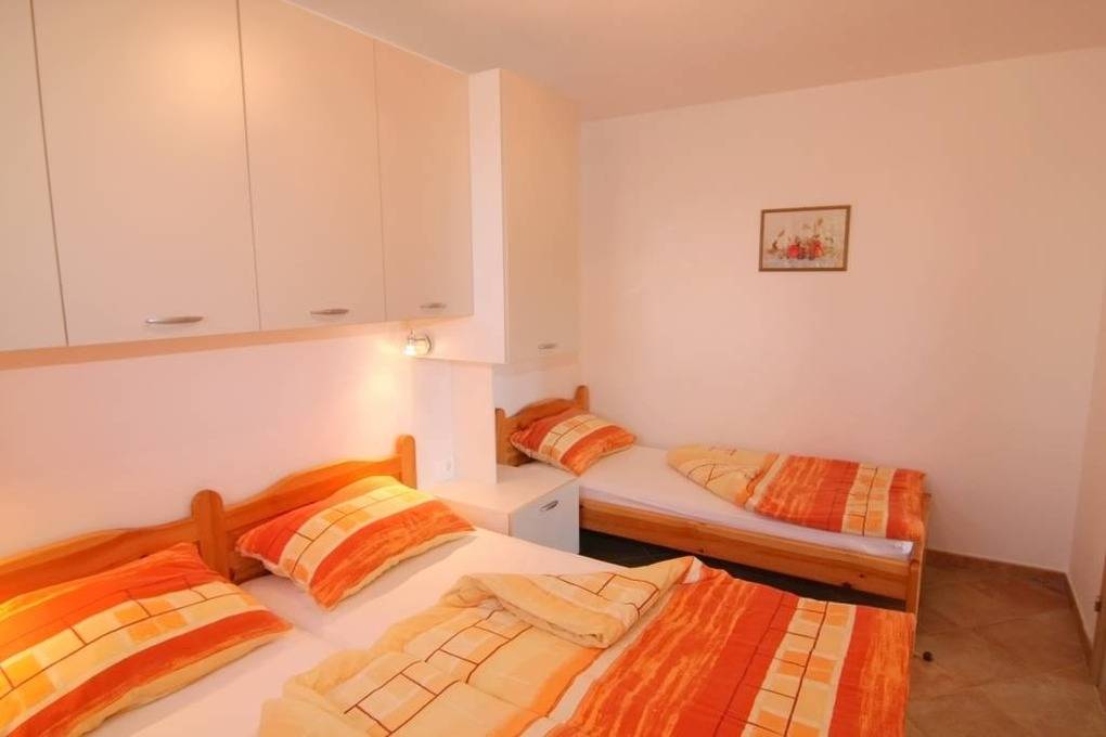 Das Elternschlafzimmer ( 2 x 90 x 200 cm ) hat einen direkten Badzugang. Das Kinderzimmer ( 2 x 90 x 200 und 1 x 90 x 170 cm ) mit drei Betten hat ebenfalls ein separates Bad. Bedingt durch die eingebauten Kleiderschränke ist genügend Stauraum vorhanden.
