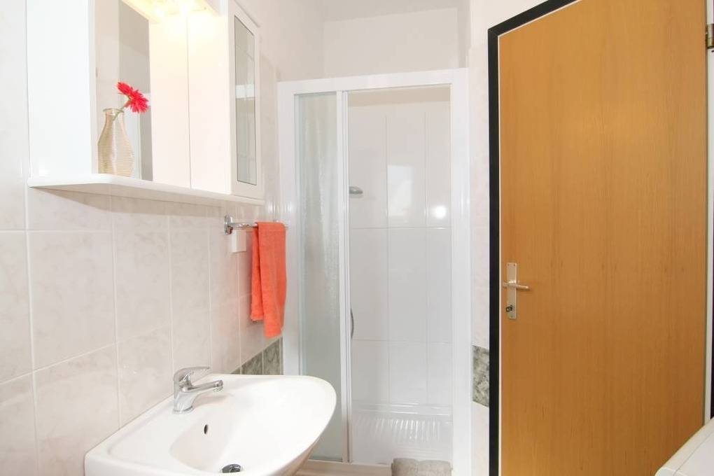 Im Bad mit Dusche und Toilette befindet sich auch die Waschmaschine. Im Wohnbereich befindet sich das Sat-TV sowie der Eßbereich für 4 Personen. Direkter Ausgang auch zur Terrasse.