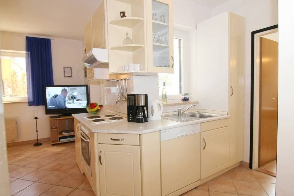 In den Schränken der Küche finden Sie ausreichend Platz für Stauraum und die Küchenkomplettausstattung. Ein 4-Platten-Herd und Backofen, Dunstabzugshaube, Kühlschrank mit Eisfach, Kaffeemaschine, Mikrowelle, Spülmaschine, Elektrogrill, Wasserkocher sowie Staubsauger runden das Angebot ab.