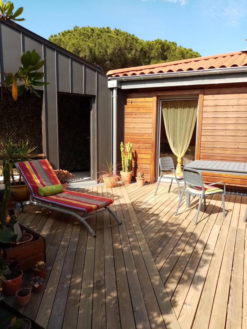 Dieses klimatisierte Ferienhaus in einer von einem Architekten entworfenen Holzvilla verfügt über schattige Terrassen und eine schöne Loggia, die auf Anfrage zur Aufbewahrung von Fahrrädern oder Tauchausrüstung abgesichert werden kann.
