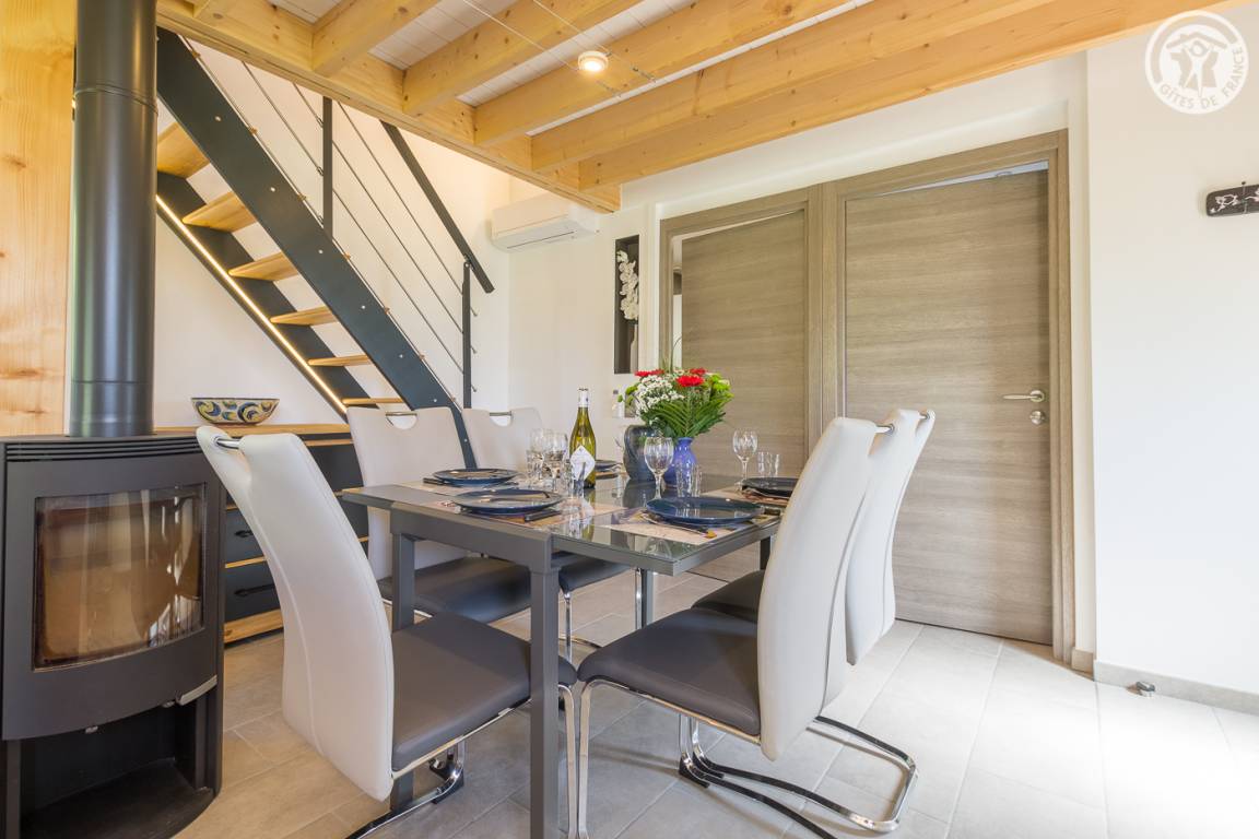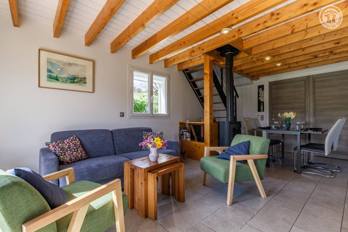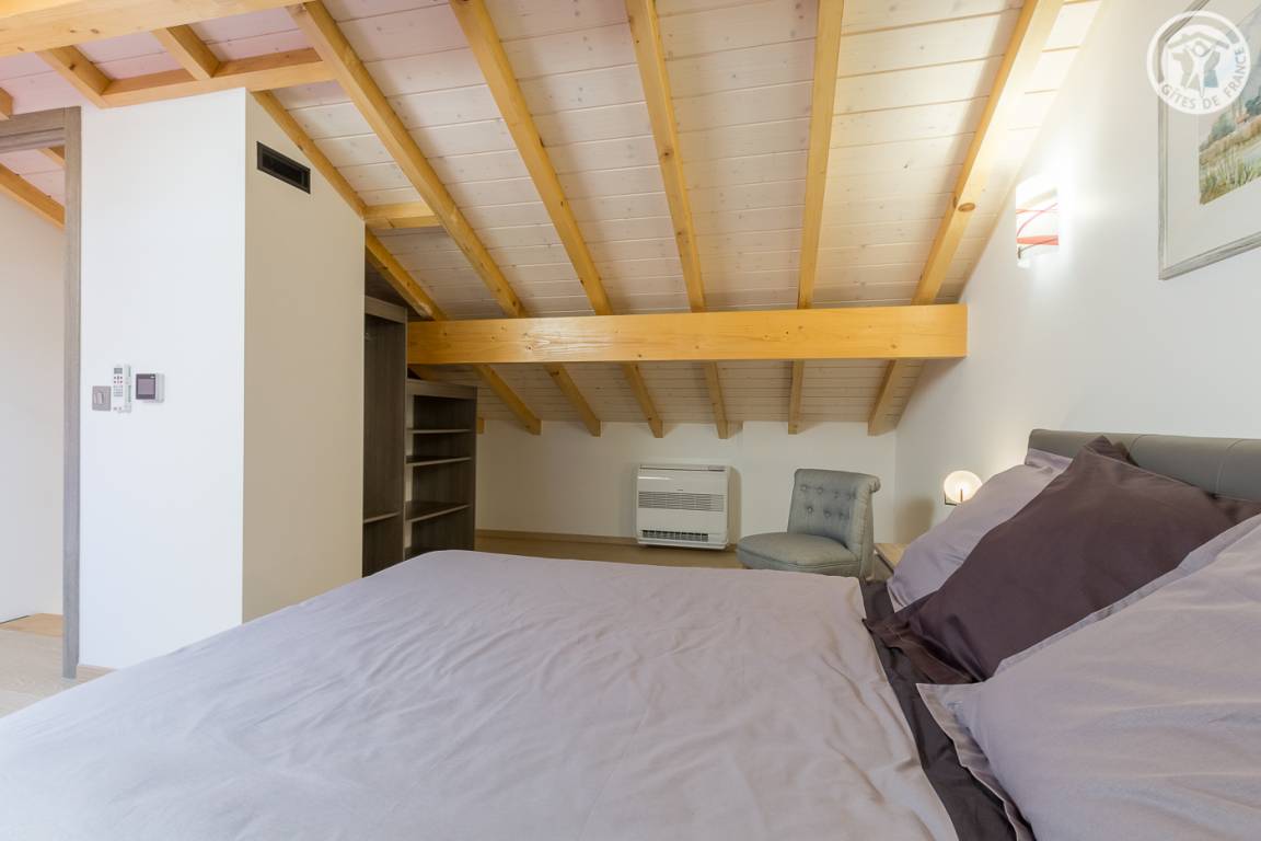 Freistehendes Haus: im Erdgeschoss das Wohnzimmer mit Zugang zur Terrasse und zum Garten (mit einem 140x190 cm großen Schlafsofa), Badezimmer (Dusche und Waschküche) und separates WC. Ferienhaus mit Klimaanlage. Im 1. Stock: Familienzimmer (1 Doppelbett 140x190 cm und 1 Einzelbett 90x190 cm). Privater Parkplatz (2 Stellplätze) und großer privater Garten.