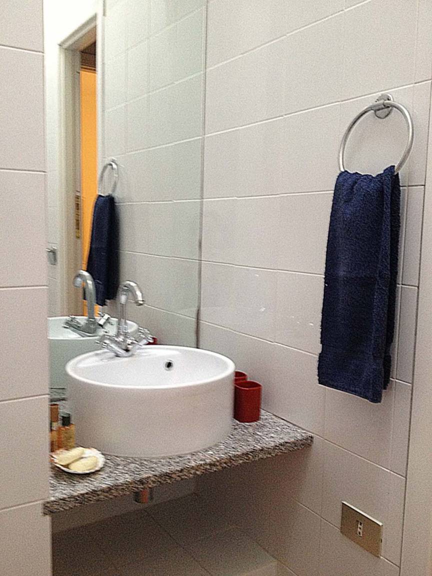Schlafzimmer mit Bad 4: Doppelbett, WiFi Internet, tragbarer Ventilator, Waschbecken, Bidet, Dusche, Fön, Ausgang auf den Patio.
