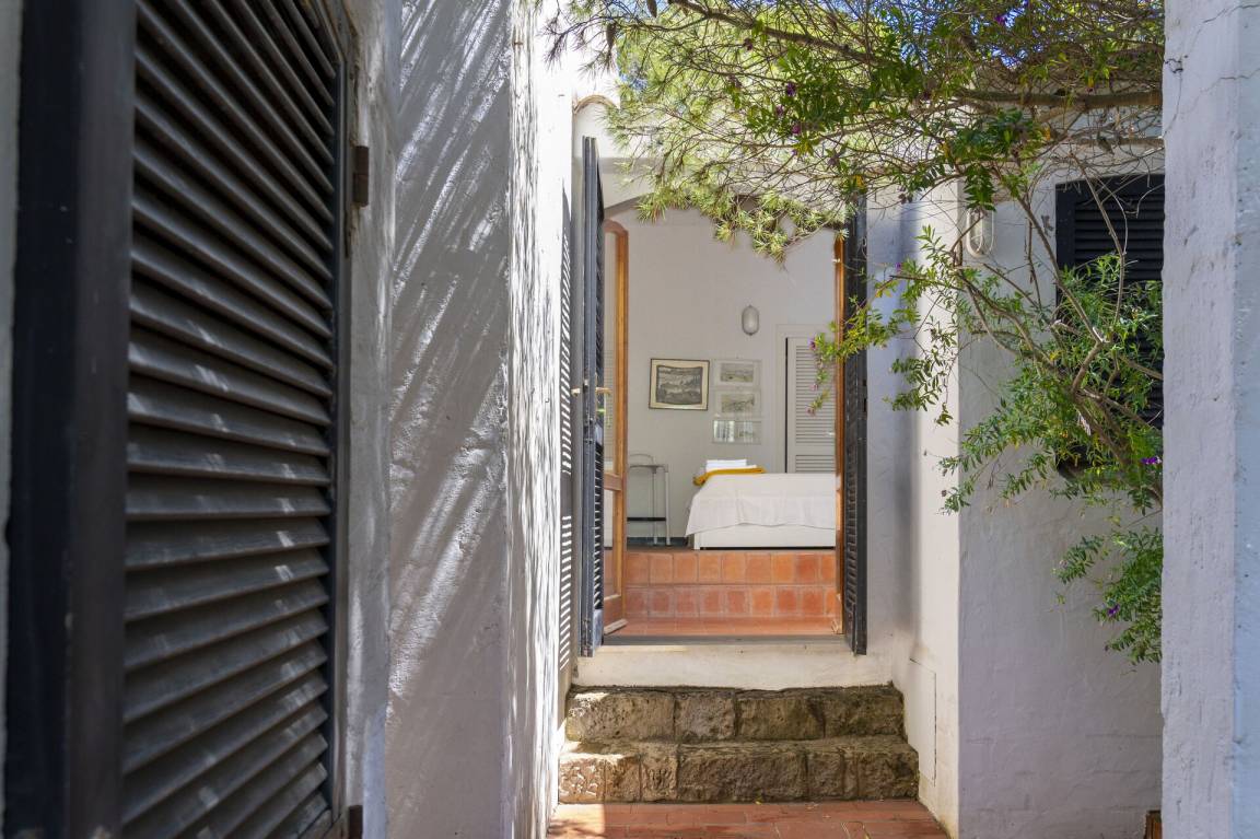 Schlafzimmer mit Bad 1: Doppelbett, WiFi Internet, tragbarer Ventilator, Waschbecken, Bidet, Dusche, Fön, Ausgang auf den Garten.