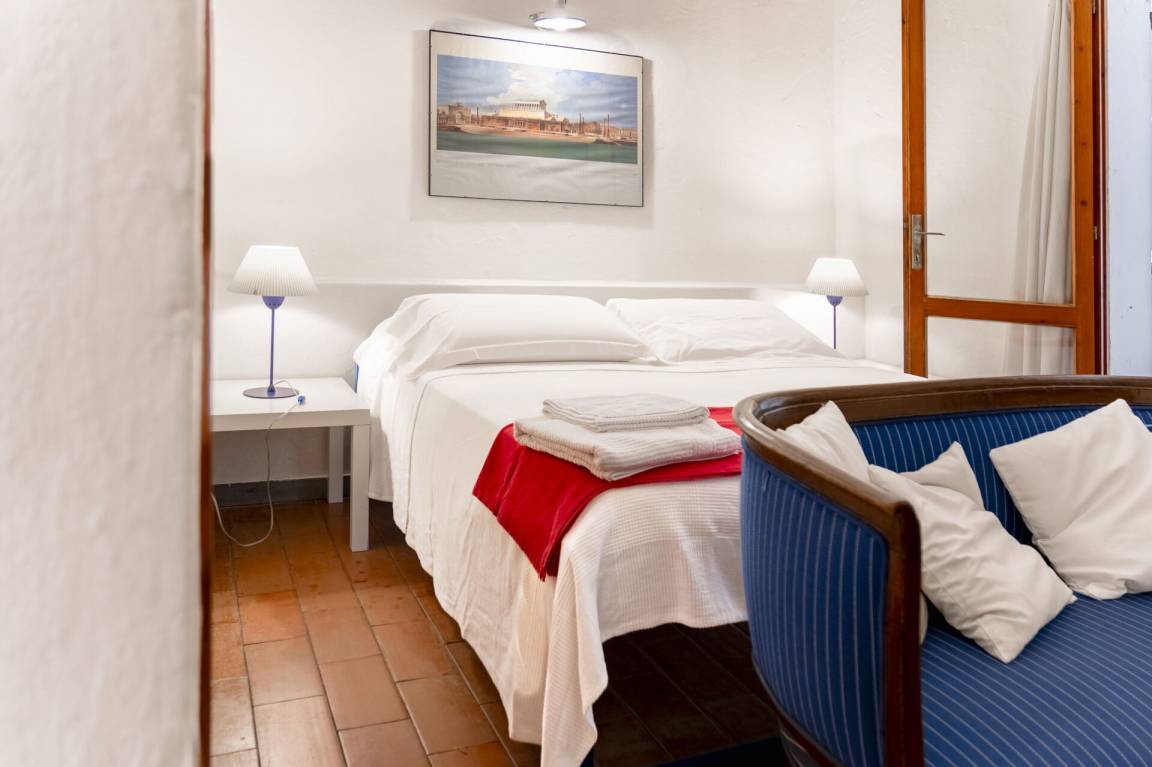 Schlafzimmer mit Bad 2: Doppelbett, WiFi Internet, tragbarer Ventilator, Schreibtisch, Waschbecken, Bidet, Dusche, Fön, Ausgang auf die Veranda.