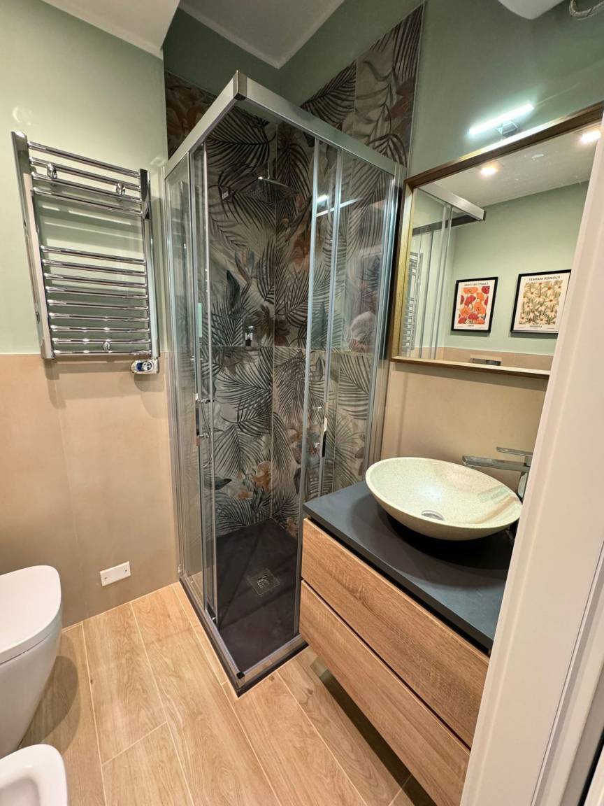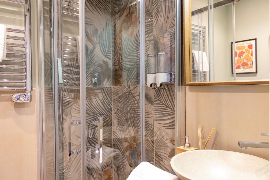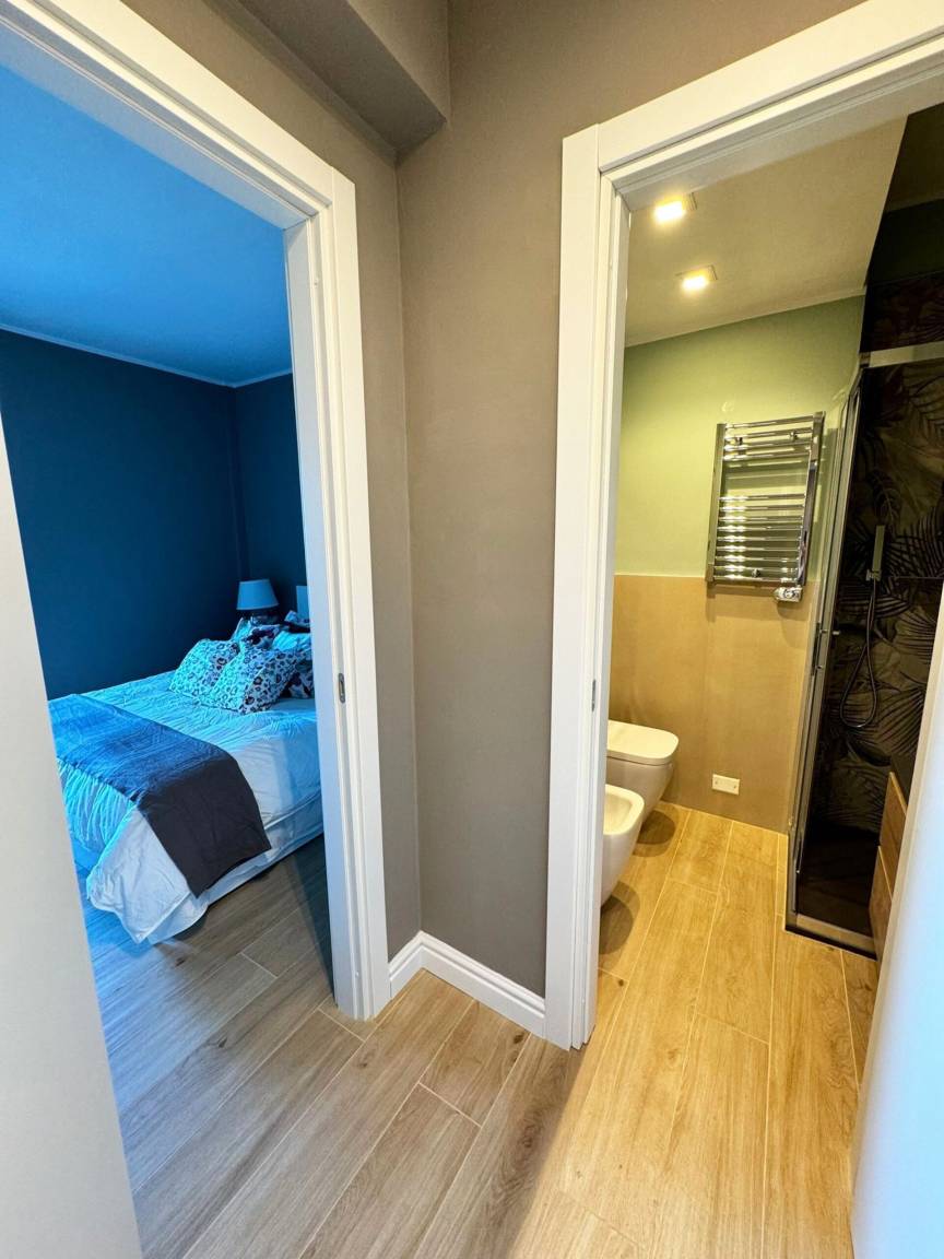 Schlafzimmer mit Bad: Doppelbett, WiFi Internet, Klimaanlage, Satelliten-TV, Waschbecken, WC, Bidet, Fön, Ausgang auf den Balkon.