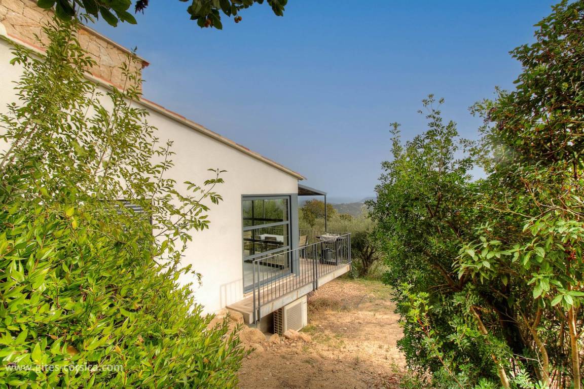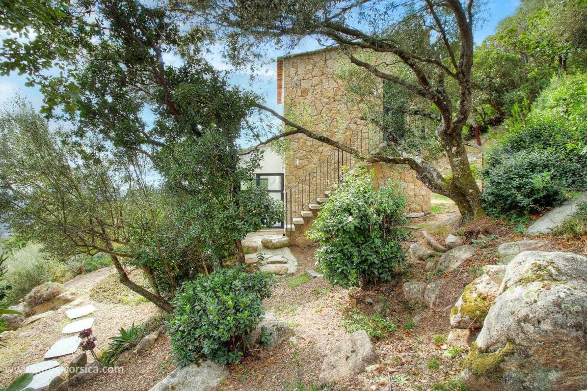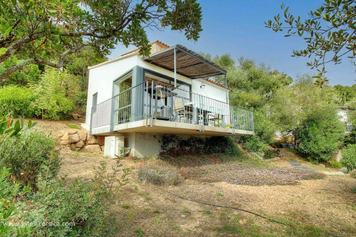 In einem Weiler auf den Höhen von Porto-Vecchio, inmitten der Macchia, unabhängiges Haus von 57 m² auf 2 Ebenen auf einem gemeinsamen geschlossenen Grundstück von 3500 m², das ein weiteres Ferienhaus umfasst. Es setzt sich wie folgt zusammen: