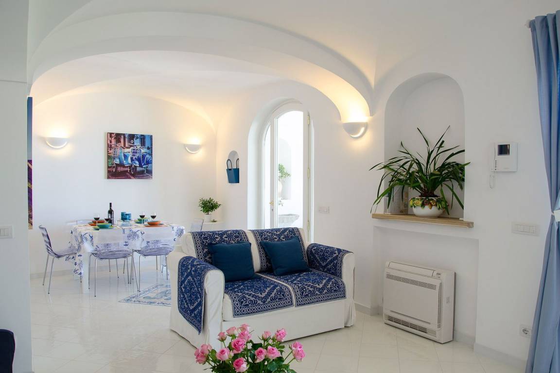 Die Villa il Sogno di Praiano bietet Platz für bis zu 4 Gäste und verfügt über 2 Schlafzimmer und 2 Bäder. Die Raumaufteilung verbindet Wohnbereiche im Inneren mit Außenflächen und schafft eine Verbindung zwischen dem Innenraum und dem Meerblick.