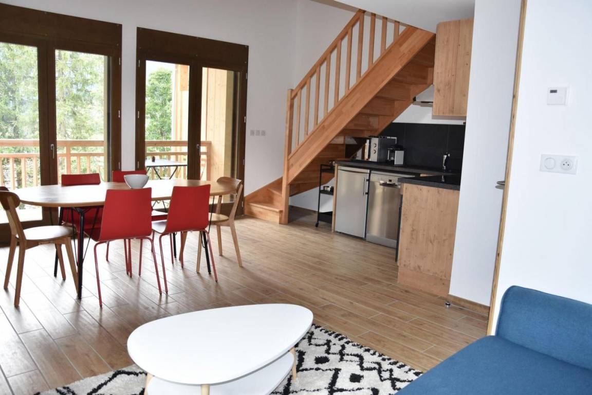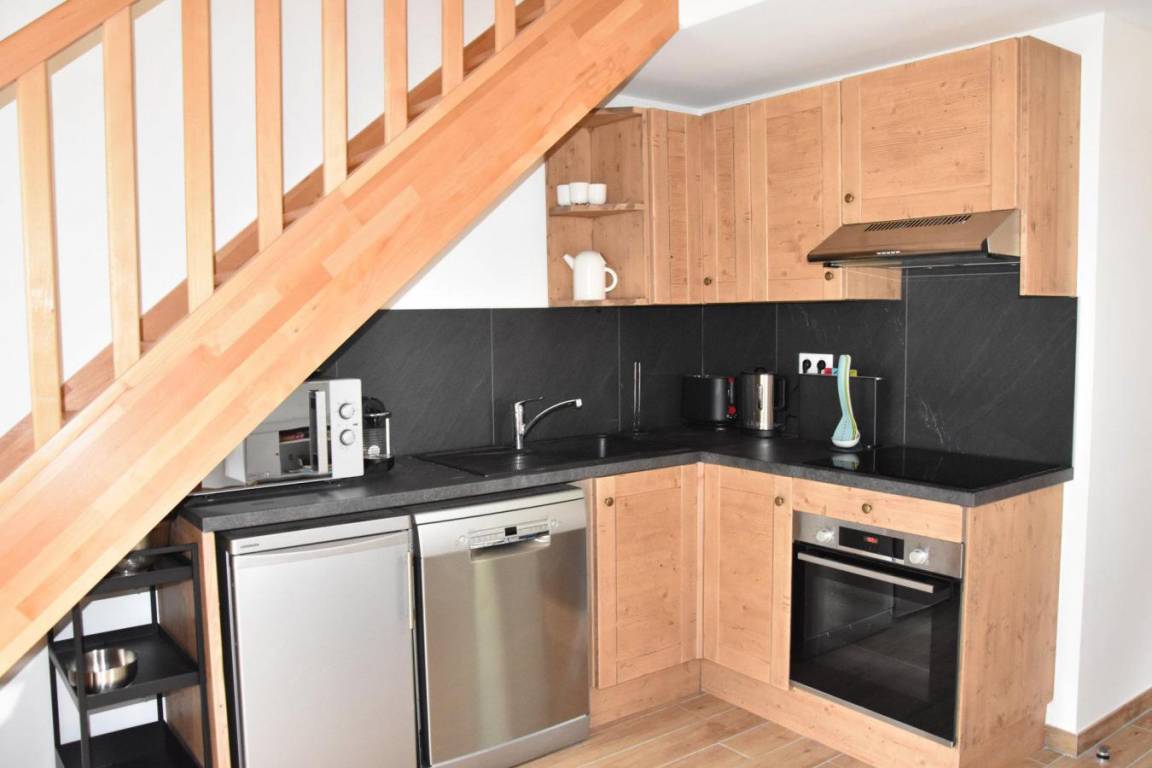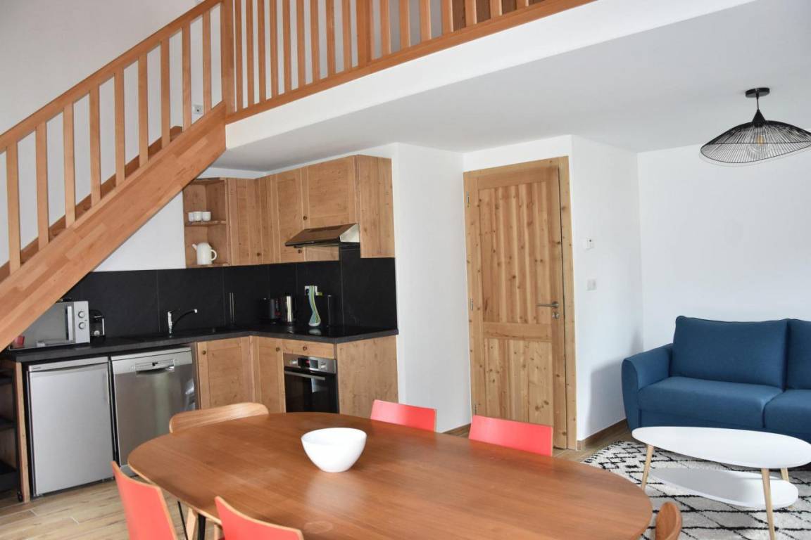 Fläche von ungefähr 60 m². 1te Etage. Wohnzimmer. Schlafzimmer mit Doppelbett. Schlafzimmer mit Ausziehschlafcouch für 2 Personen, 2 Stockbetten. Zwischengeschoss mit Doppelbett (140). Kochnische mit Backofen, Geschirrspülmaschine, Mikrowellenherd, 2 Glaskeramikkochfelder, Kühlschrank. Badezimmer. separates WC. Balkon ab 8.00 m². Keller mit Waschmaschine. Die oberen Betten sind nicht für Kinder unter 6 Jahren geeignet.