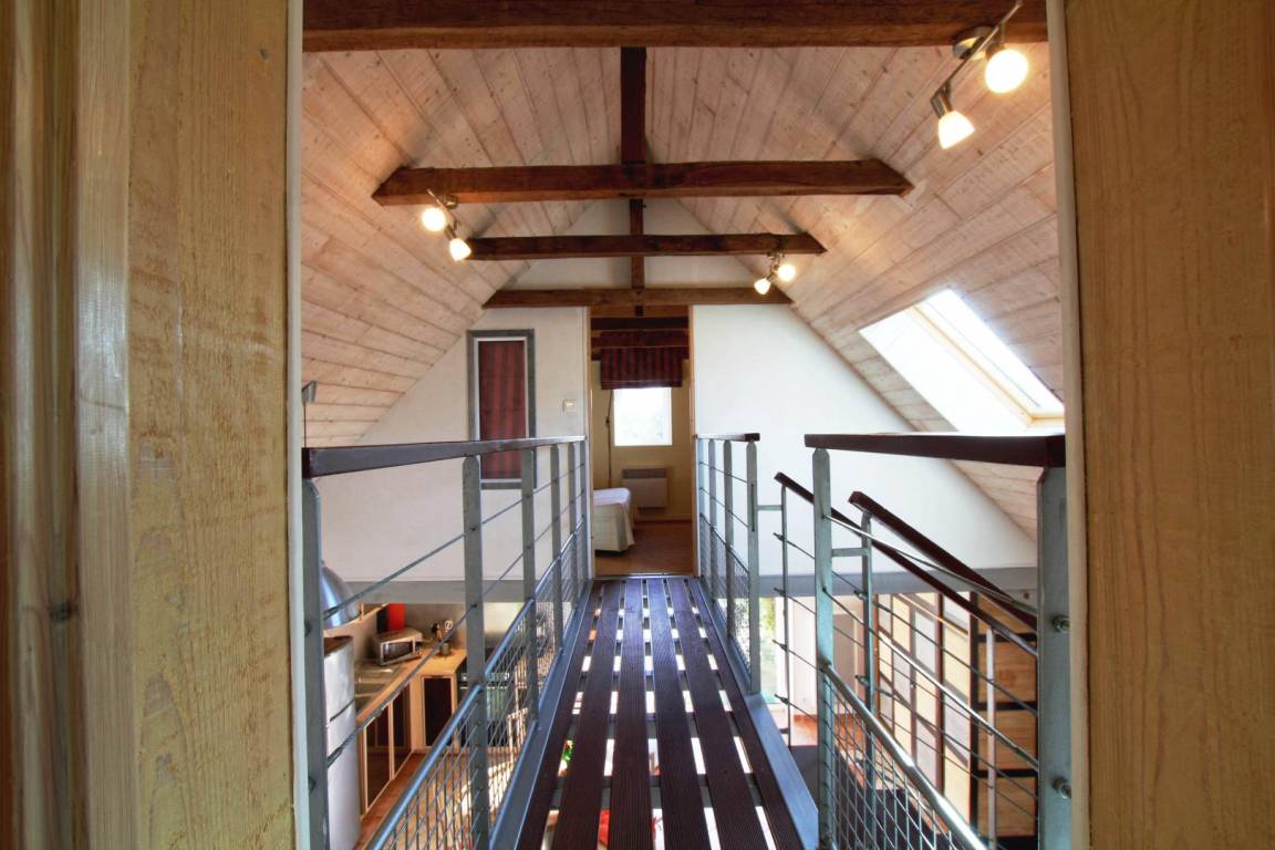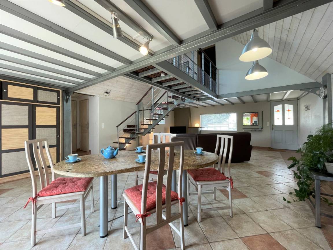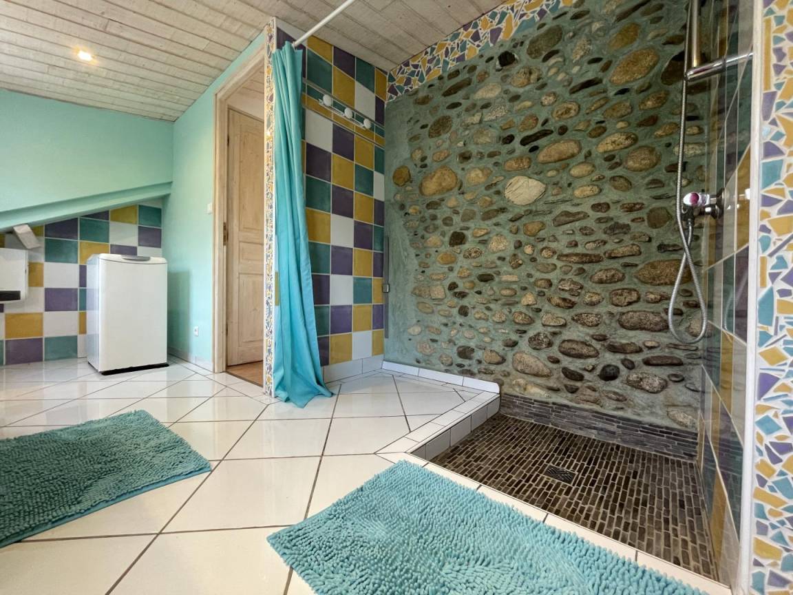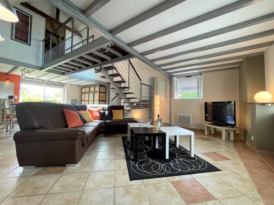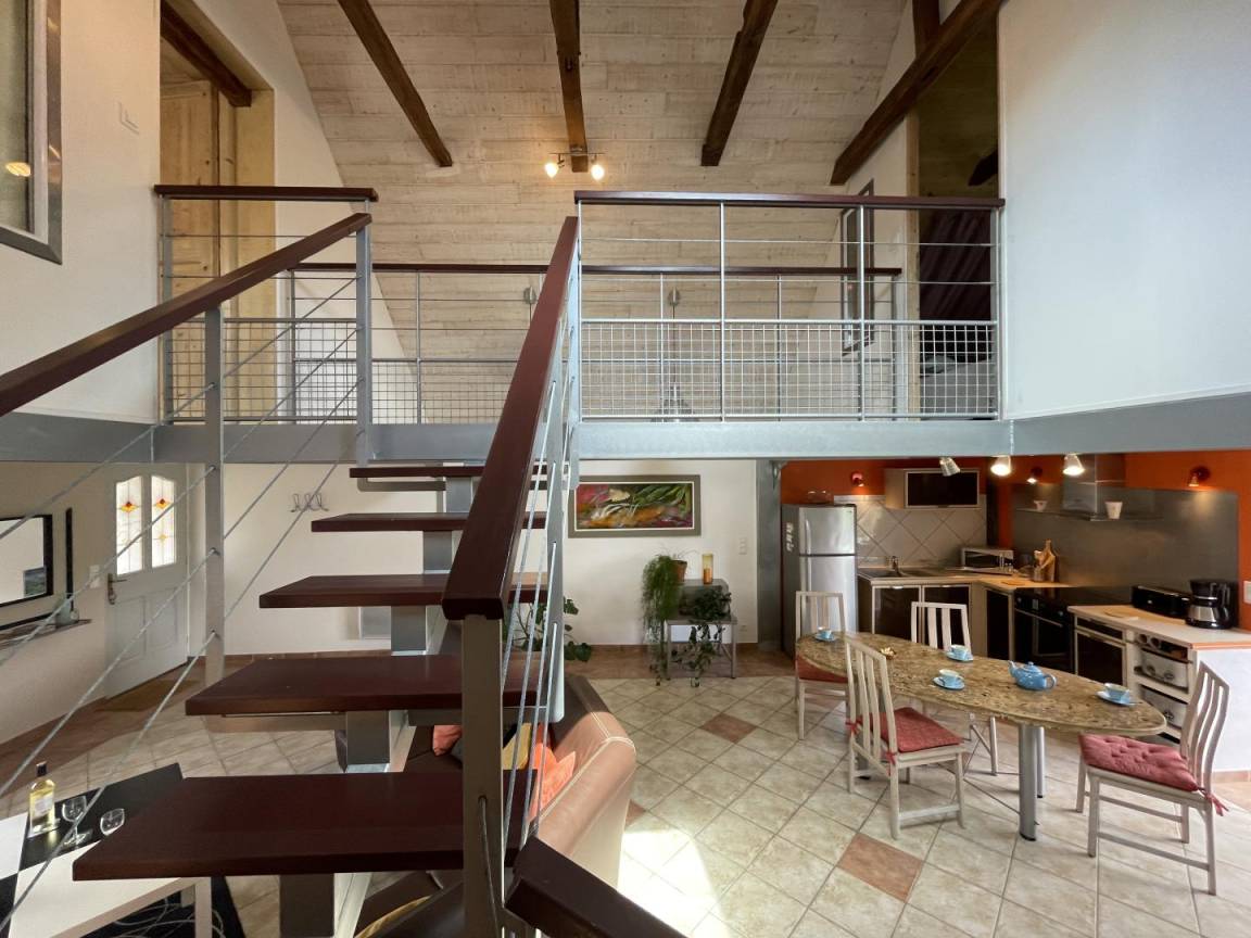 Gîte im Obergeschoss (Zugang über Außentreppe). Ausgestattete Küche (Induktionsplatten, Kühlschrank mit Gefrierfach, Backofen und Mikrowelle). Wohnzimmer (TV, WLAN-Verbindung). Duschraum (Waschmaschine), WC.