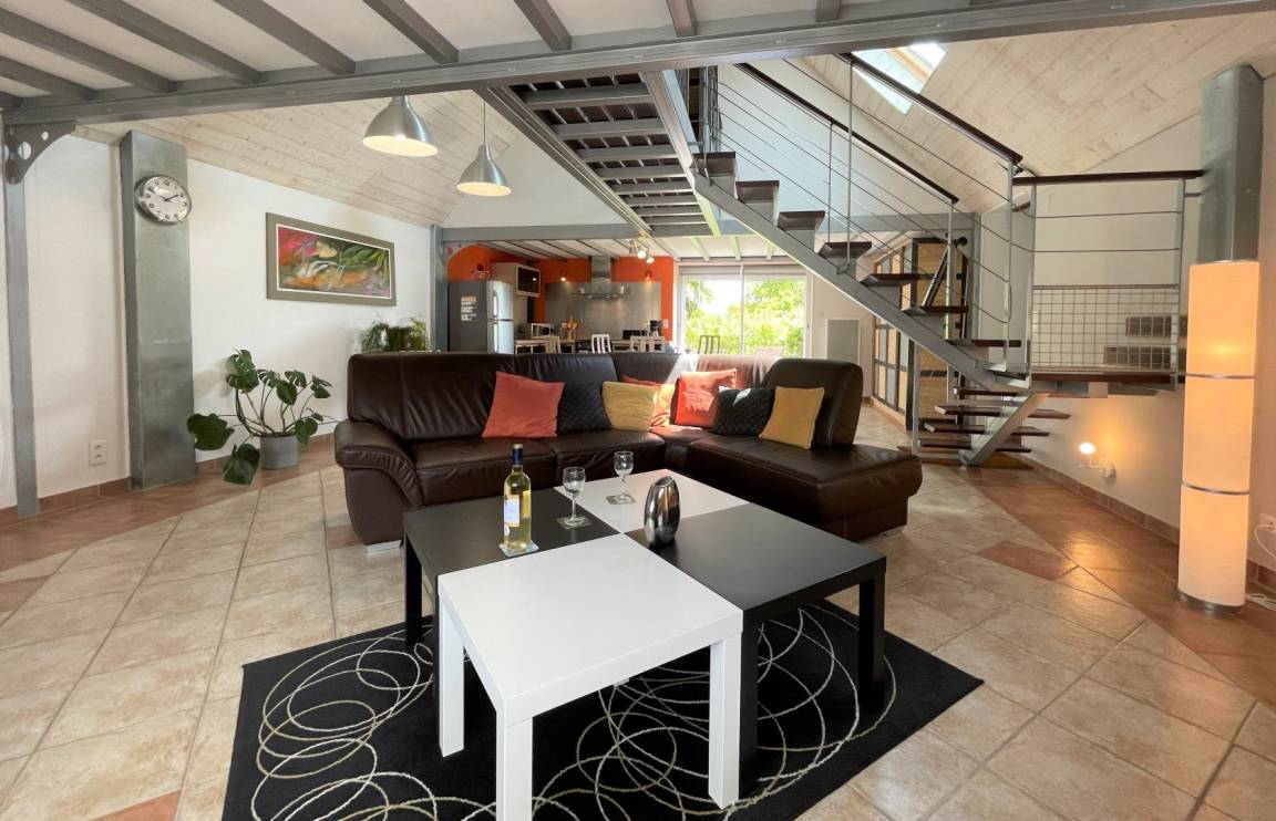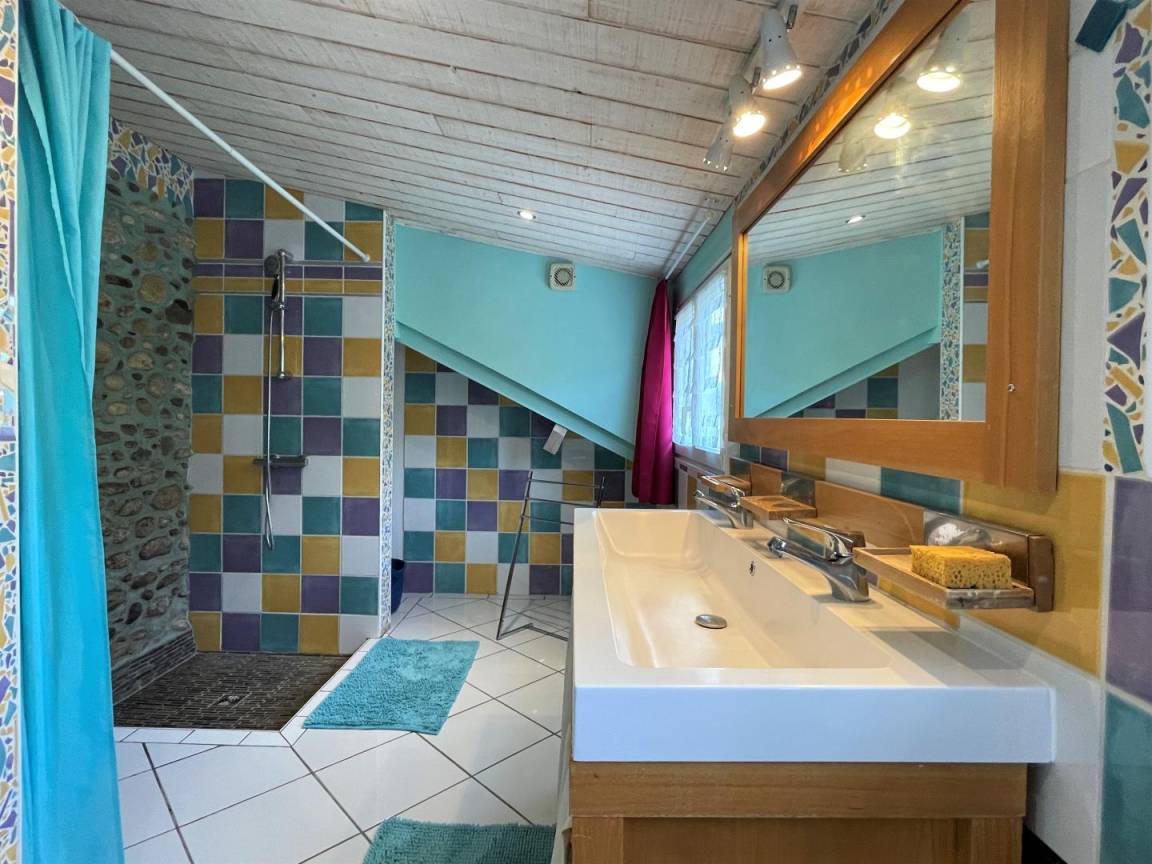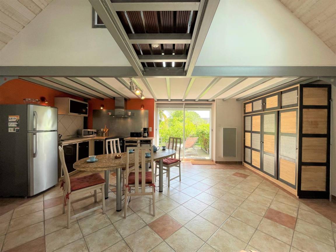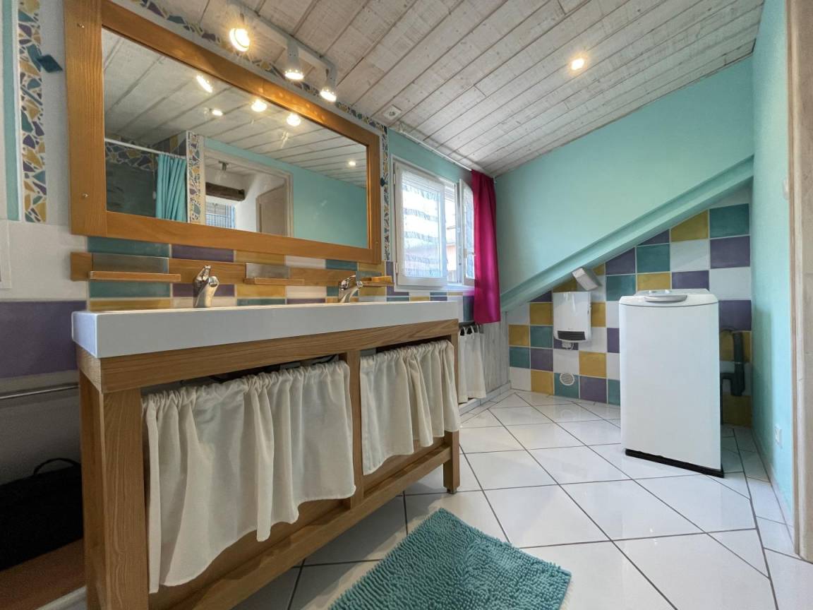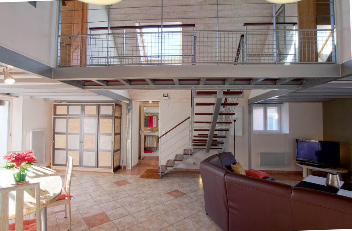 Gîte im Obergeschoss (Zugang über Außentreppe). Ausgestattete Küche (Induktionsplatten, Kühlschrank mit Gefrierfach, Backofen und Mikrowelle). Wohnzimmer (TV, WLAN-Verbindung). Duschraum (Waschmaschine), WC.