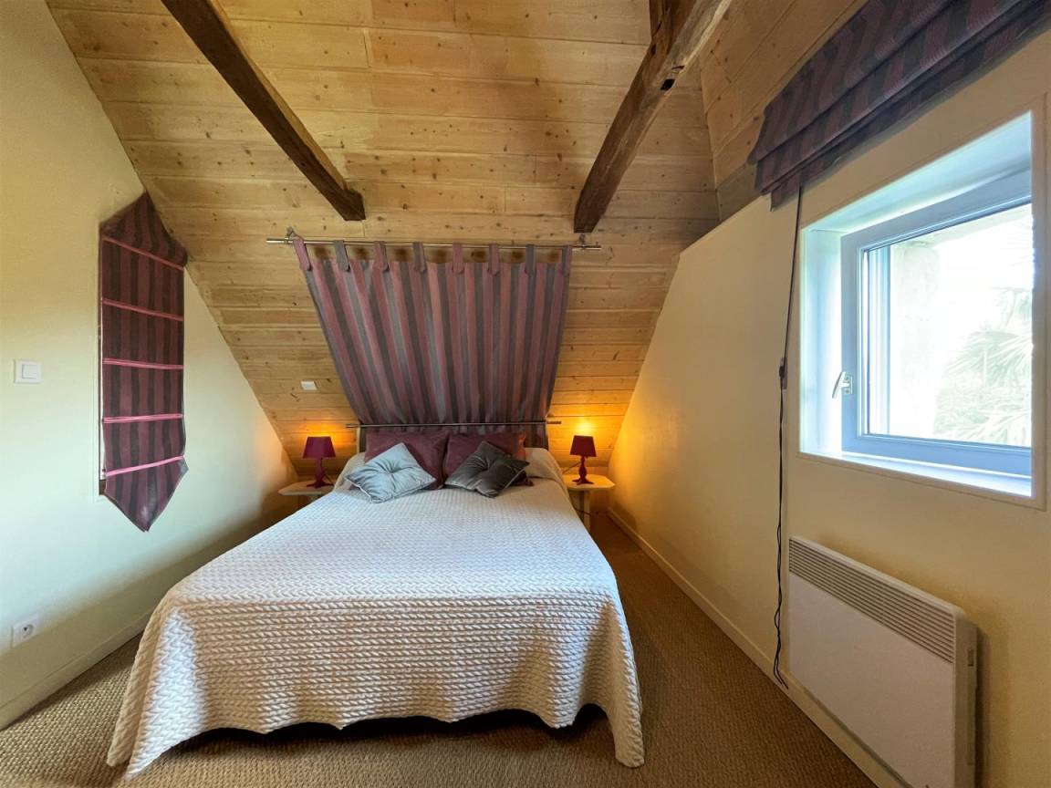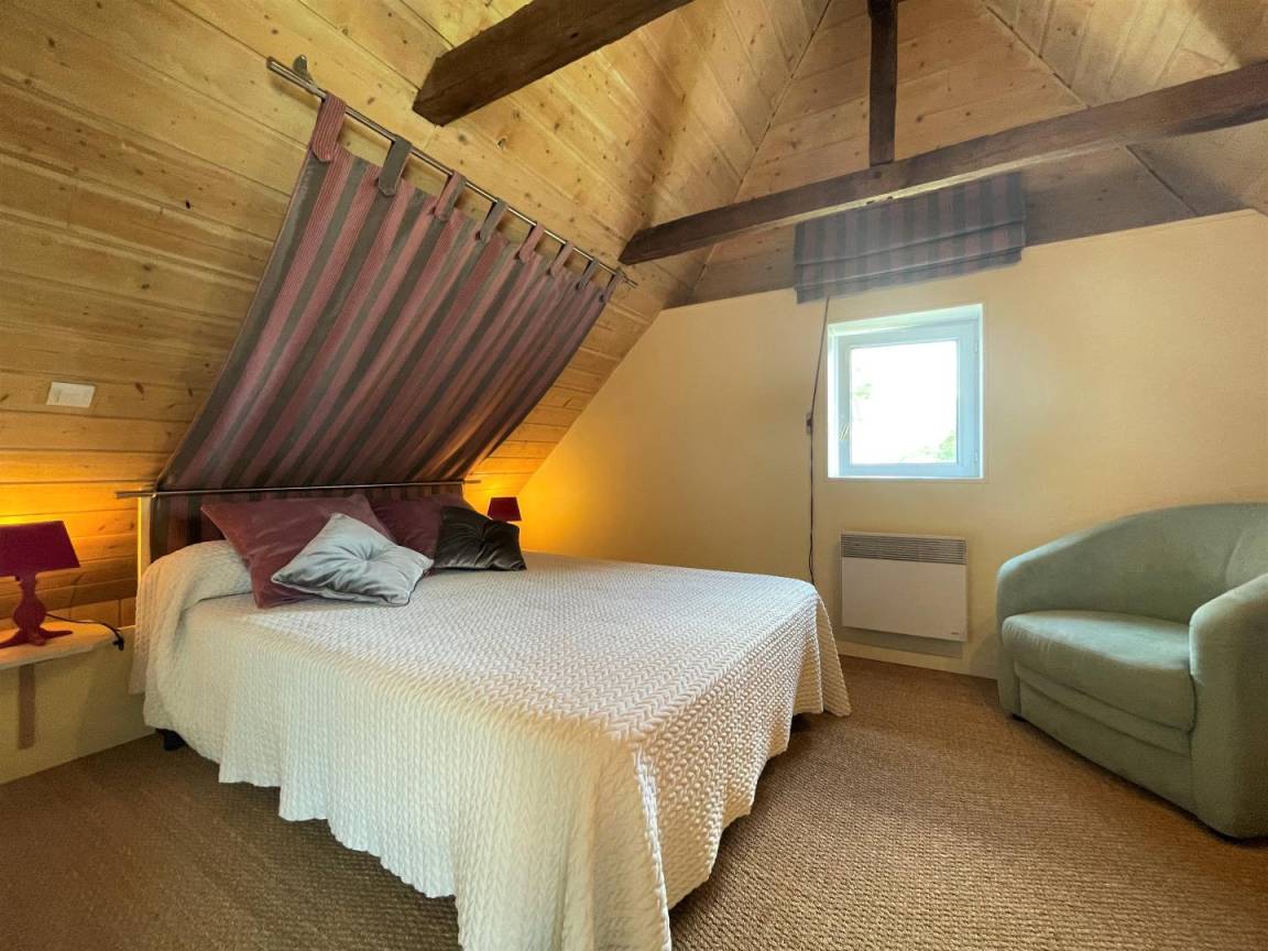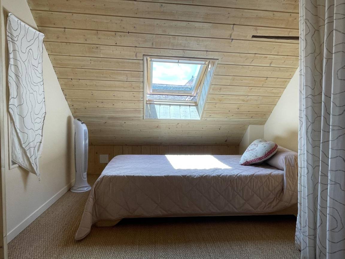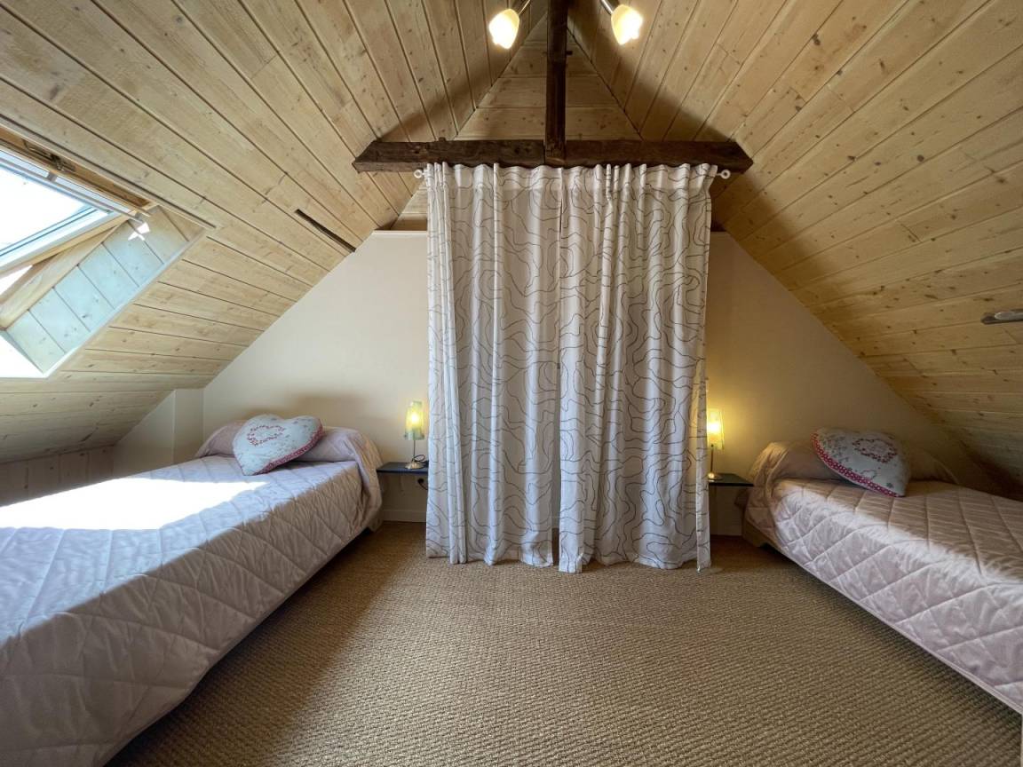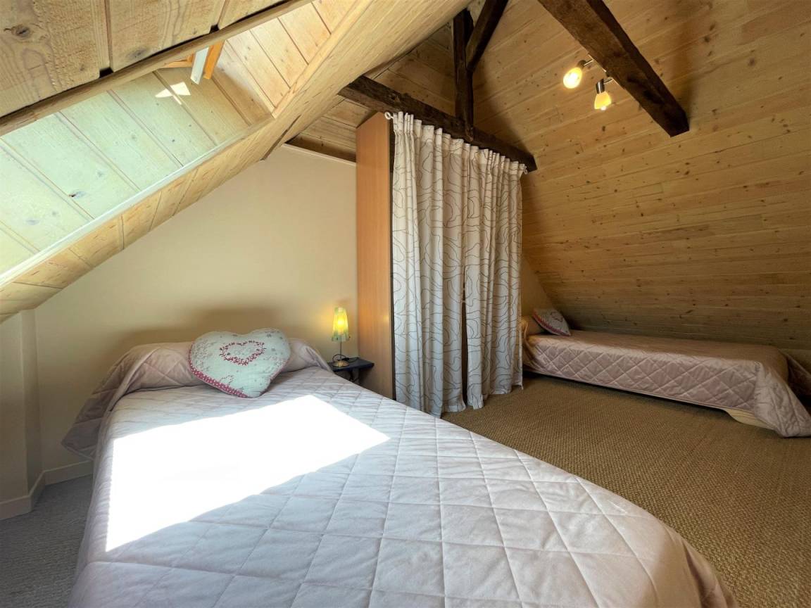 2. Ebene. 2 Schlafzimmer im Dachgeschoss (1 Doppelbett. 2 Einzelbetten). Möglichkeit, Bettwäsche und Handtücher zu mieten.