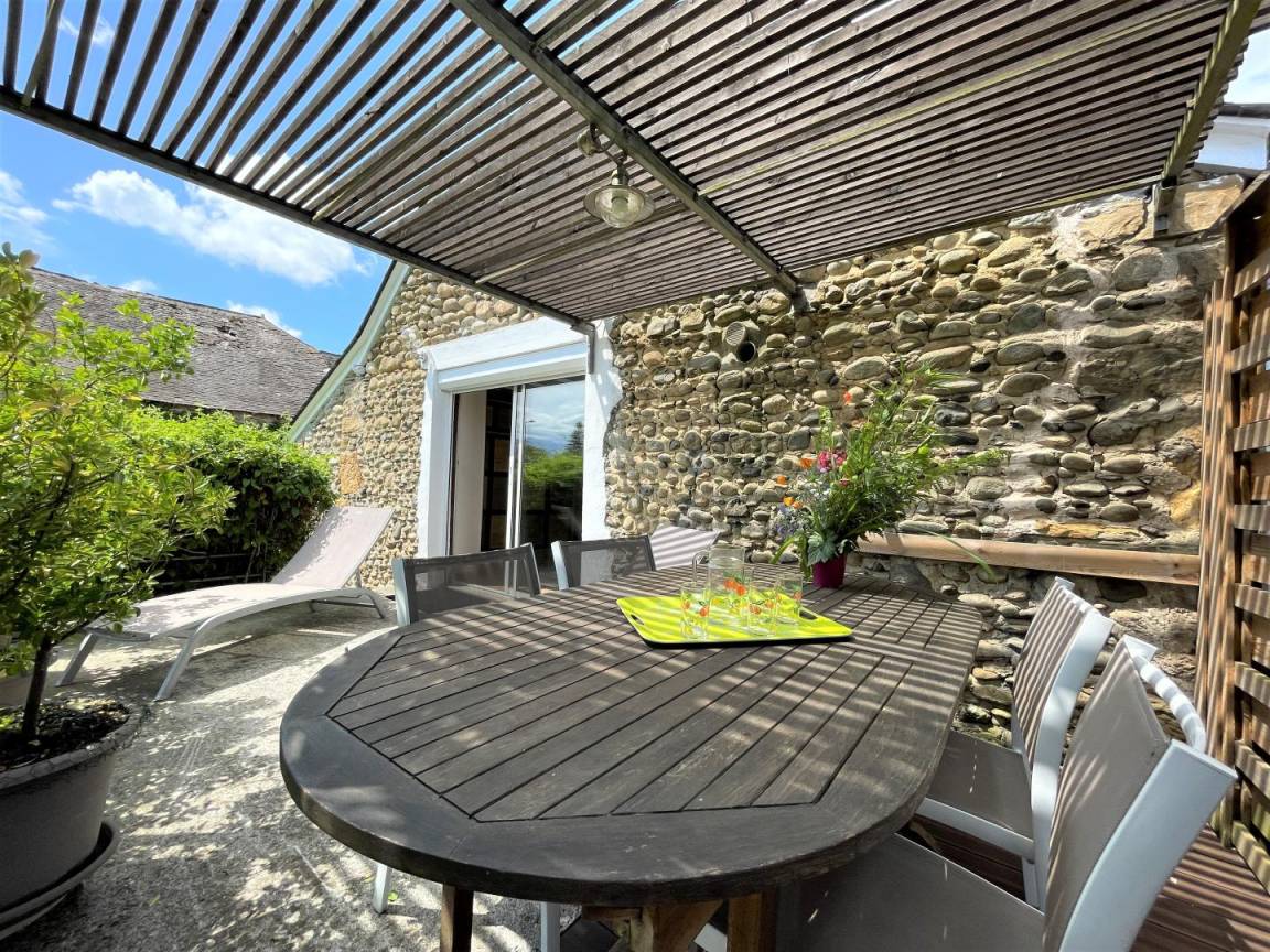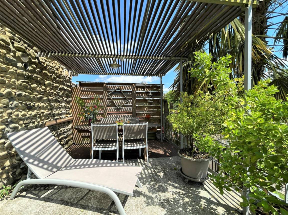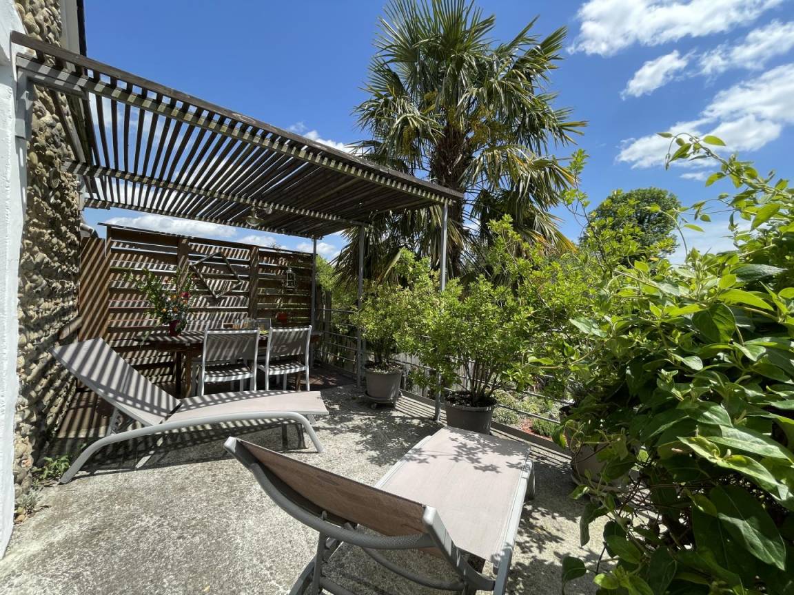 Angenehme Terrasse unter Pergola im Obergeschoss, angrenzend an das Wohnzimmer mit Gartenmöbeln und Liegestühlen.