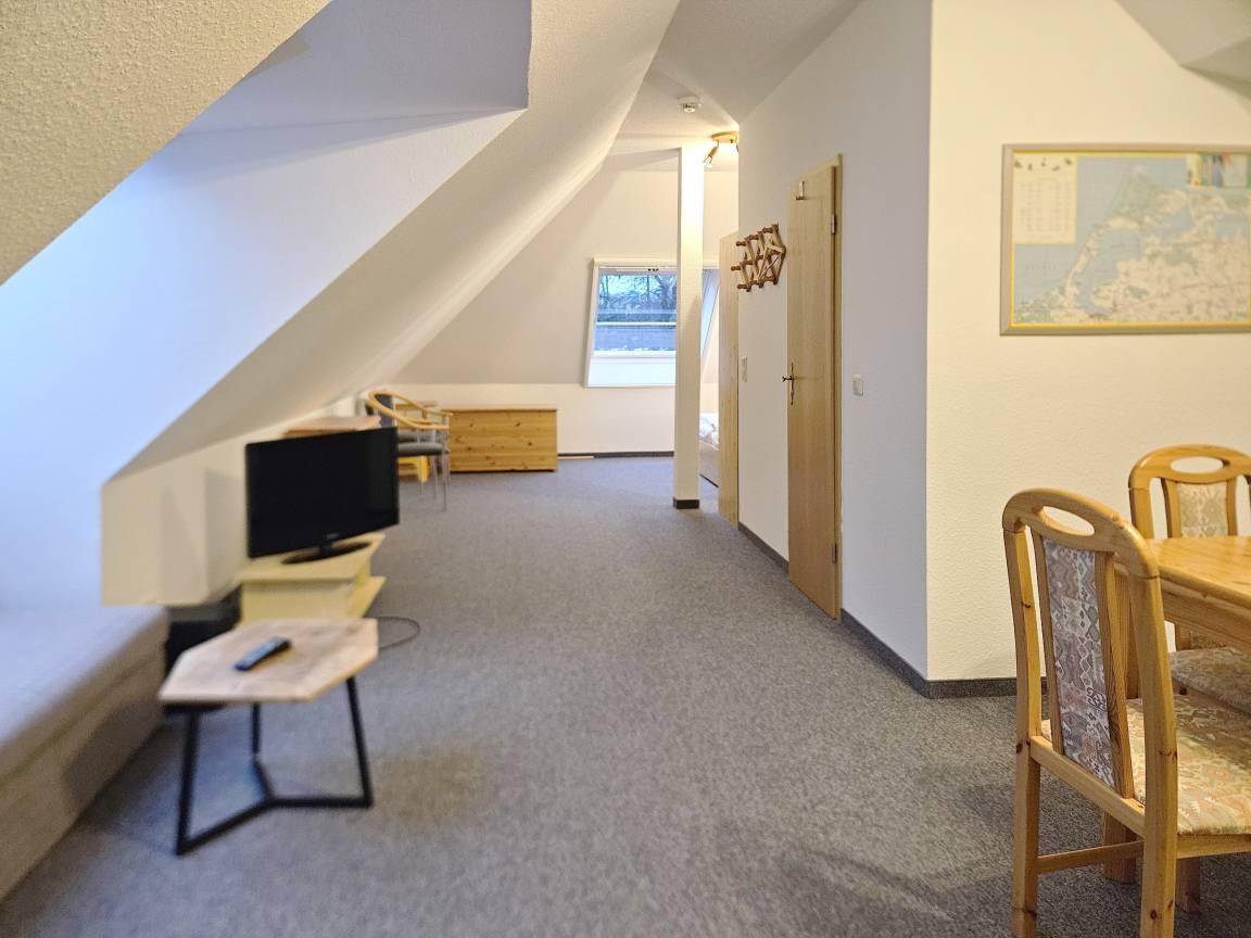 Die Ferienwohnung befindet sich im ersten Obergeschoss und besteht aus einem Raum, der einen Wohn- und Küchenbereich mit Esstisch sowie einen Schlafbereich mit einem Doppelbett beinhaltet. Das dazugehörige Badezimmer verfügt über eine Dusche und ein WC. In der gesamten Wohnung sind Dachschrägen vorhanden. Es gibt keine Türen zwischen dem Wohn- und Schlafbereich. Vor dem Haus steht ein kostenloser Parkplatz zur Verfügung. Im Gemeinschaftsschuppen können Fahrräder abgestellt werden. Außerdem gibt es im Haus eine Waschmaschine und einen Trockner, die gegen Gebühr von allen Bewohnern genutzt werden können.
