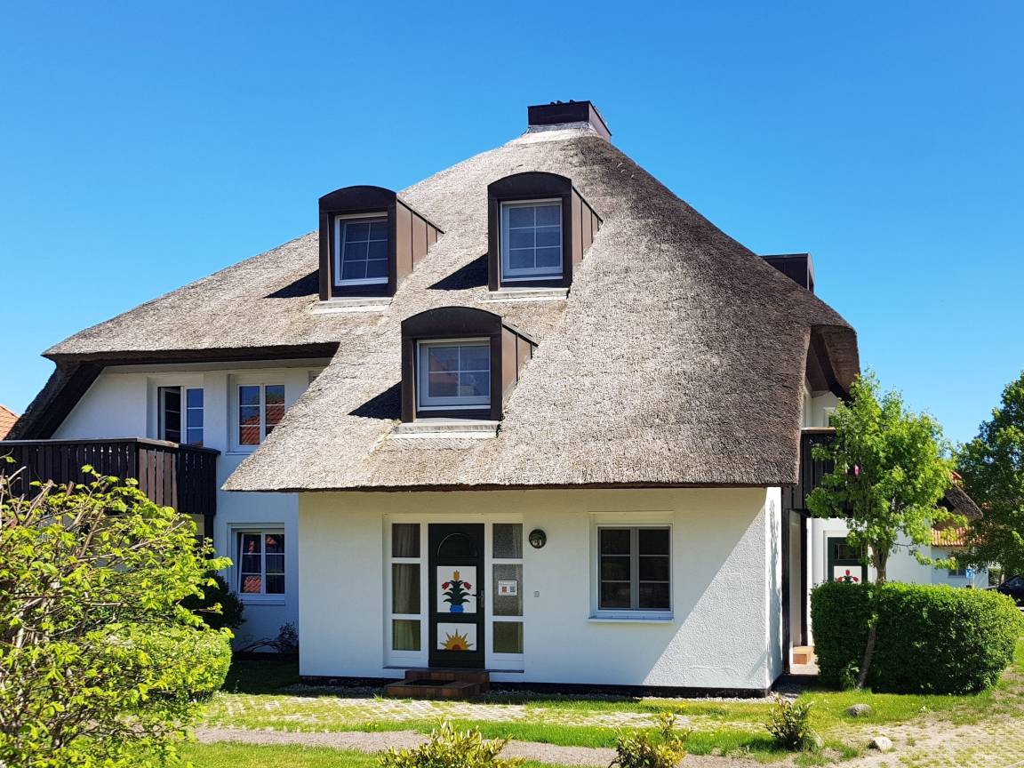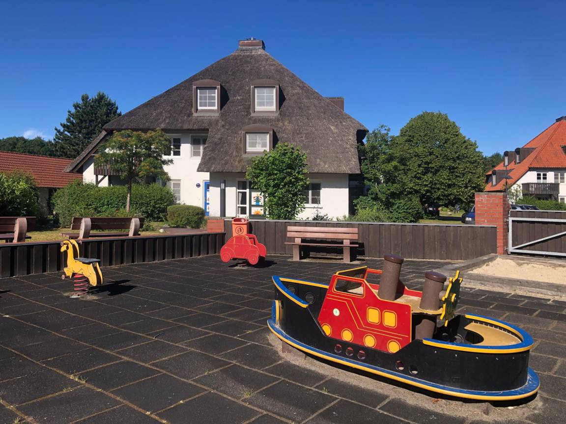 Die Ferienwohnung liegt im EG eines reetgedeckten Ferienhauses und besteht aus einem Wohnraum mit Einbauküche, einem großzügigen Schlafraum, einem Bad mit Dusche und WC, sowie einem zusätzlichen Gäste-WC.