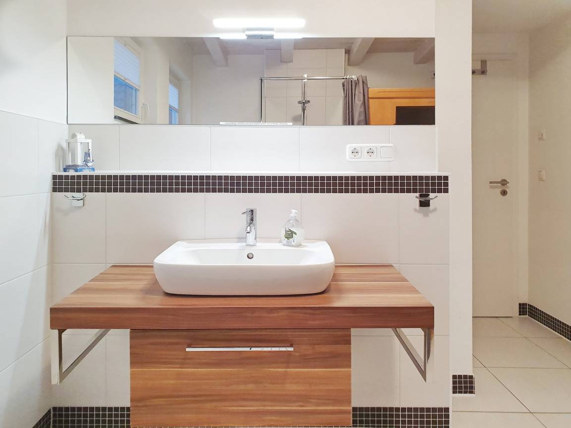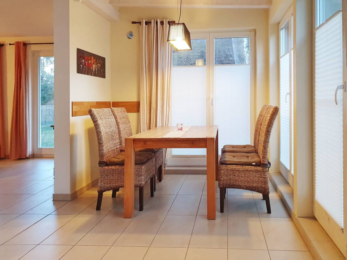 Die westliche Ferienhaushälfte wird hier zur Vermietung angeboten, die andere Haushälfte wird zeitweise vom Eigentümer selbst genutzt. In der ca. 58 qm großen Ferienwohnung können bis zu 3 Personen und 1 Kleinkind einen entspannten Urlaub genießen. Die Ferienwohnung ist modern und[nbsp] stilvoll eingerichtet. Hierzu trägt neben dem gemütlichen Wohnzimmer mit Couch Sat-TV, Musikanlage mit Radio und CD, auch ein Kaminofen und im Bad eine Infrarot-Wärme-Kabine bei. An den Wohnraum schließt sich eine komfortabel ausgestatte Küche mit Backofen, Geschirrspüler, Kühlschrank (ohne Gefrierfach), Mikrowelle, Filterkaffeemaschine, Wasserkocher, Toaster und reichlich Geschirr an. Eine große gemütliche Sitzecke befindet sich direkt neben der Küche.