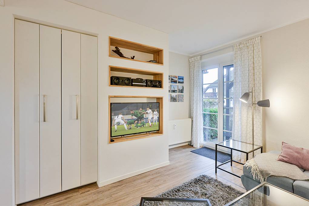 D 66.41 Wohnung 1-2 Pers.:2-Zimmerwohnung mit 55 qm Wohnfläche, Parterre. Wohn-/Essraum mit Couchgarnitur, Sat-TV, Esstisch, gut ausgestatteter Einbauküche (Backofen, 4-Platten-Induktionsfeld, Spülmaschine) thekenartig abgetrennt. Doppelzimmer. Bad: Du, Wb, WC. Separates WC. Terrasse mit Sitzmöbeln.