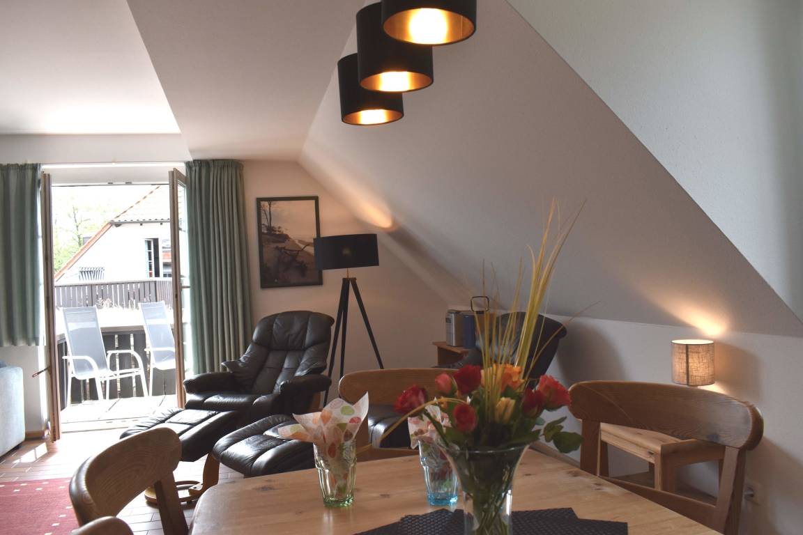 3 Zimmer-Maisonette ca. 75 qm für 2-6 Personen, Haus A in der Residenz Kormoran, Grüne Straße 45A-R, Ostseebad Prerow. 1.OG: Wohnzimmer mit Schlafcouch, Sitzgarnitur, Kleiderschrank, SAT-TV/Radio, WLAN, Duschbad/WC, Balkon, Essecke mit Küchenzeile (Spülmaschine). 2.OG: 2 Schlafzimmer, 1x Doppelbett, 1x 2 Einzelbetten, Dusche/WC