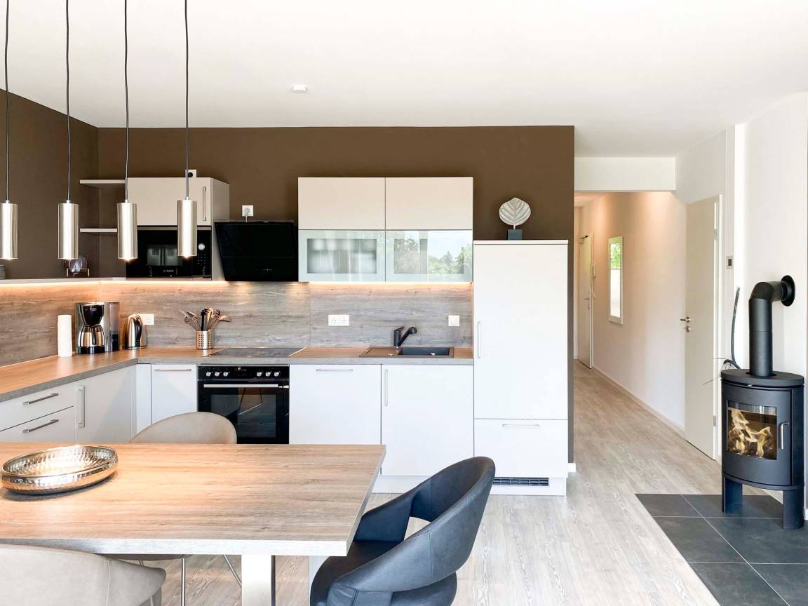 Küche: Voll ausgestattete Küchenzeile mit Induktionskochfeld, Backofen, Geschirrspüler, Kühlschrank mit Gefrierfach, Mikrowelle, Filterkaffeemaschine, Toaster und Wasserkocher
