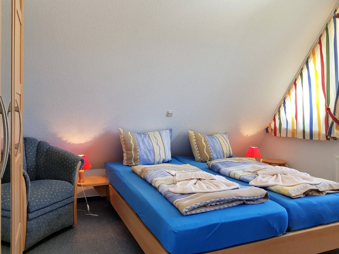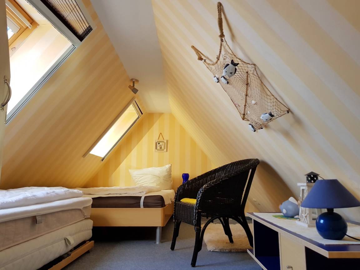 Das Dachzimmer (zweite Ebene), ist nur durchs Schlafzimmer per recht steiler Holztreppe erreichbar. Im Dachzimmer (12 qm) befinden sich 2 vollwertige Betten aber es besteht nur aus Dachschrägen (Mitte 1.60 hoch). Für Kinder ab ca. 7 J. gut geeignet.