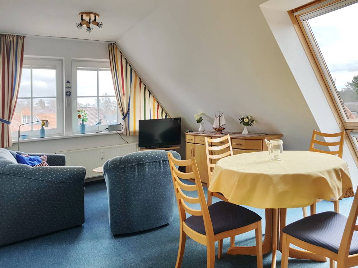 Das Wohnzimmer hat eine Küchenecke, plus Veluxausklappbalkon (für 1 Person).