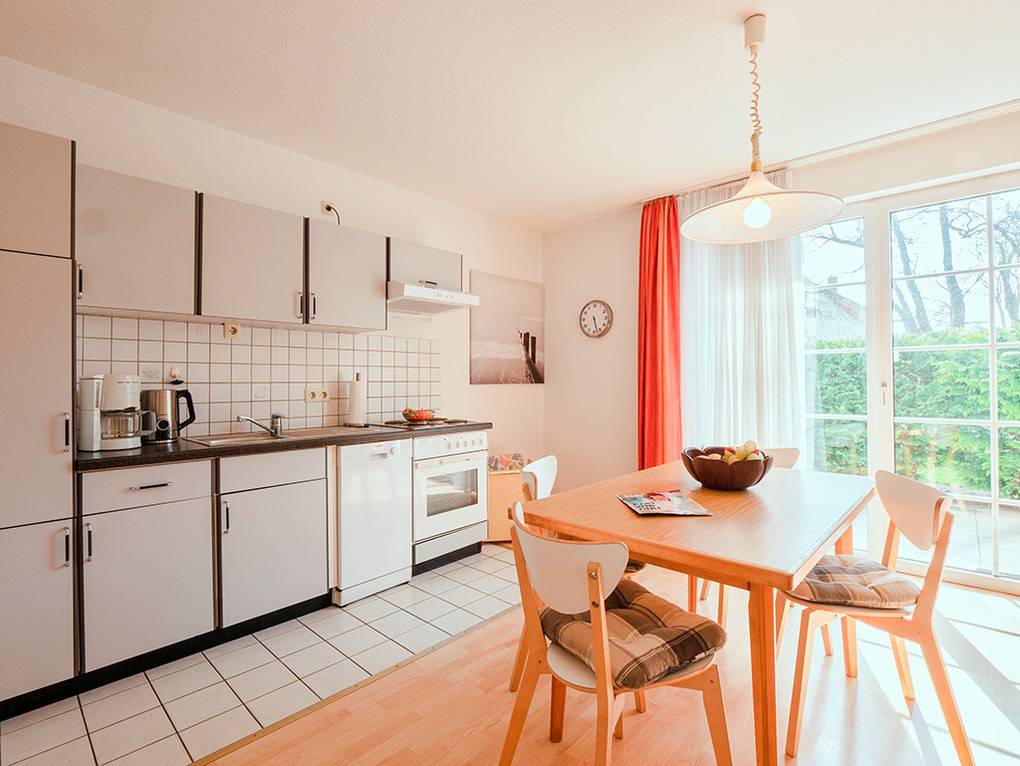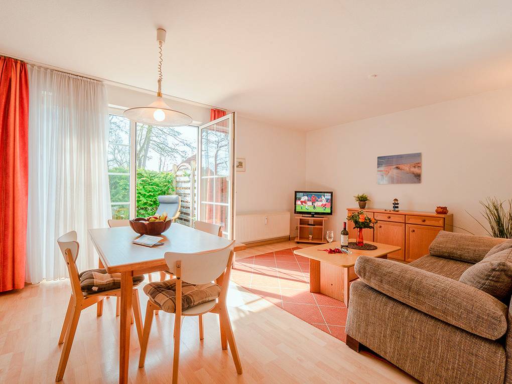 D 66.3B Wohnung 1-4 Pers.: 2-Zimmerwohnung mit 50 qm Wohnfläche, Parterre. Wohn-/Essraum mit Couchgarnitur (Ausziehcouch 2 Pers.), Sat-TV, Esstisch, Küchenzeile (Spülmaschine, Backofen). Doppelzimmer. Bad/WC. Terrasse.