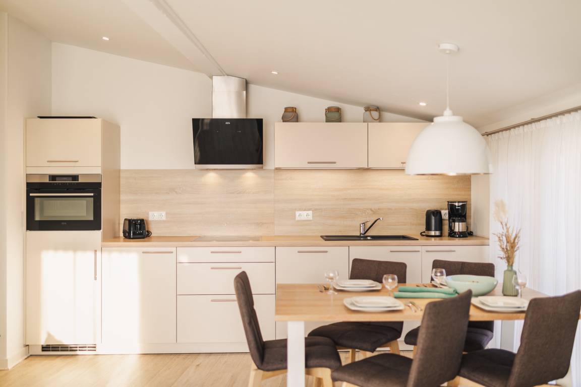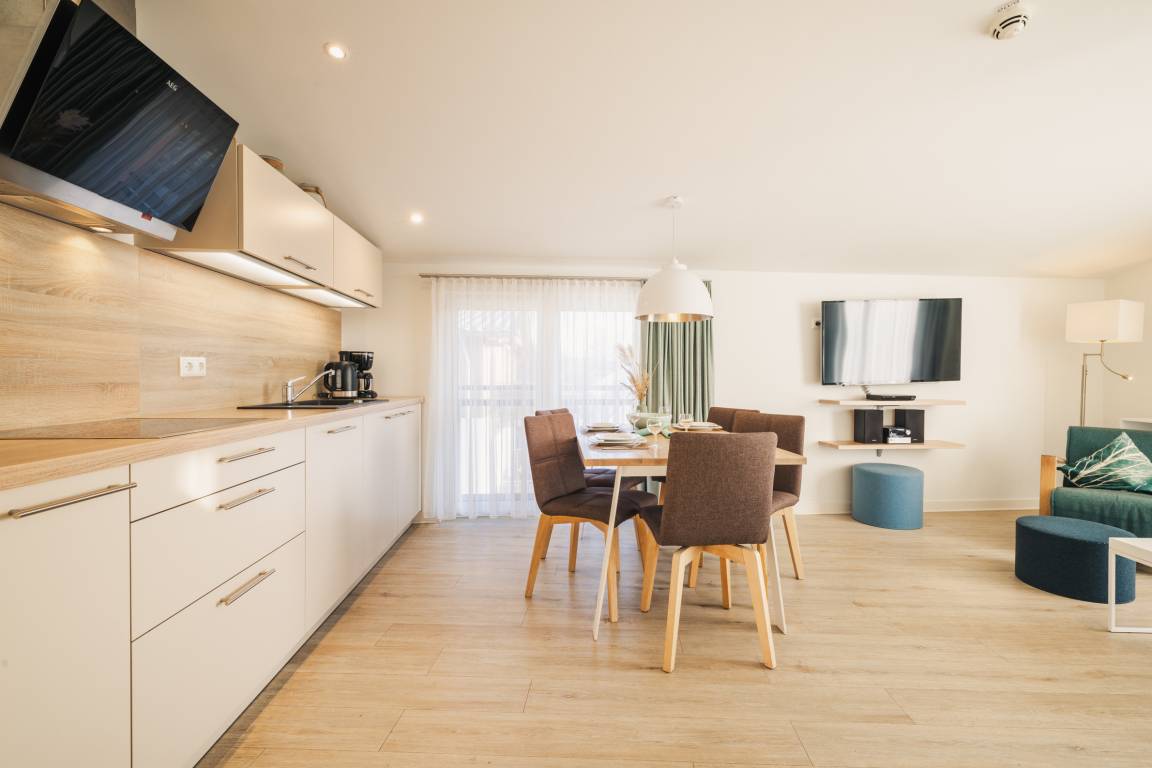 Die voll ausgestattete Küche mit Spülmaschine, Backofen, Cerankochfeld und Nespressomaschine macht die Selbstversorgung im Urlaub besonders angenehm. Ein echtes Highlight ist er Balkon – perfekt, um den Tag mit einem Frühstück an der frischen Ostseeluft zu beginnen oder abends zur Ruhe zu kommen.