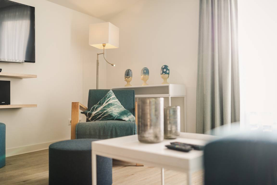 Zwei separate Schlafzimmer mit komfortablen Boxspring-Doppelbetten und TV sorgen für erholsame Nächte. Der gemütliche Wohnbereich mit großer Couch und Flat-TV lädt zu entspannten Stunden und gemeinsamen Abenden ein.
