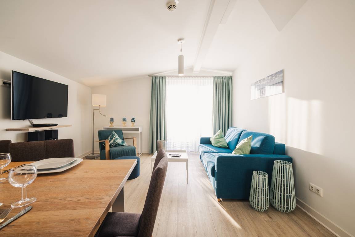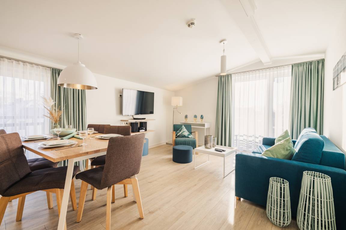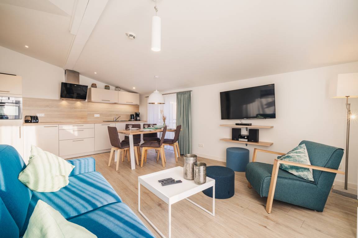 Freuen Sie sich auf entspannte Urlaubstage in diesem modernen 3-Zimmer-Appartement im Dachgeschoss, das sich ideal für Familien, Paare oder Freunde eignet. Auf ca. 56 m² Wohnfläche bietet das stilvoll gestaltete Appartement Platz für bis zu vier Personen und überzeugt mit einer hochwertigen, maritimen Einrichtung, die sofort Urlaubsstimmung aufkommen lässt.