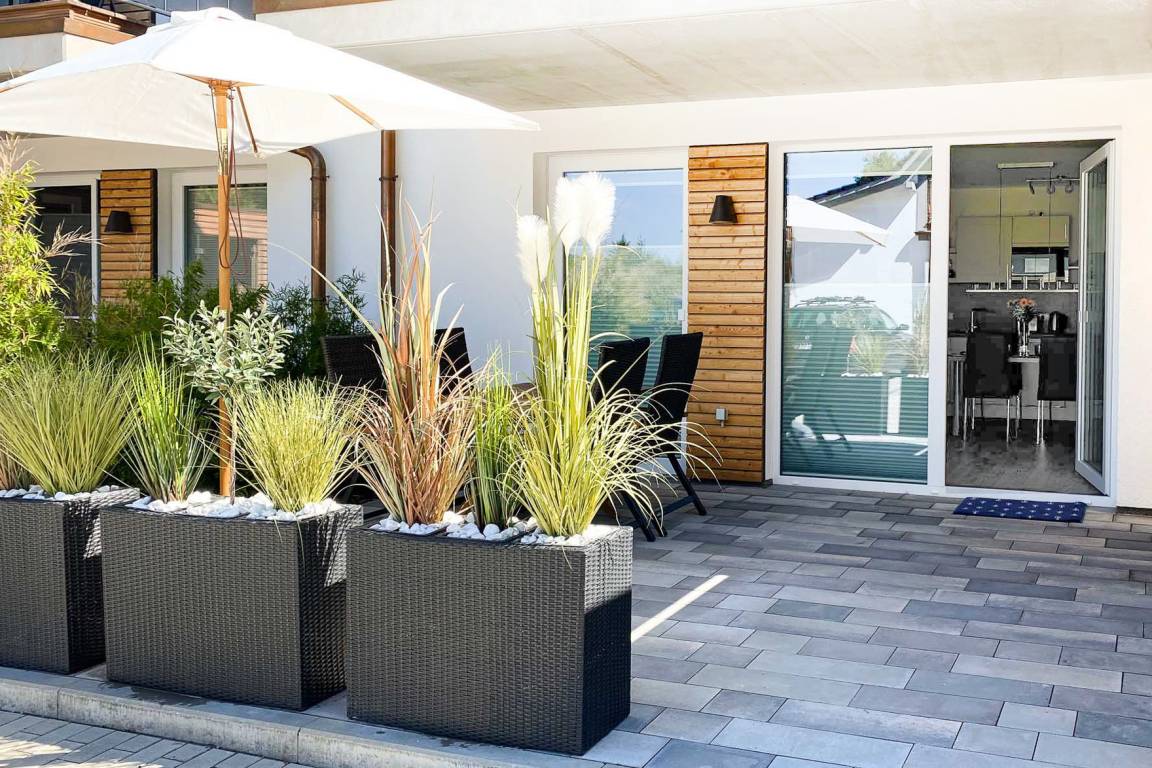 Terrasse: Westlich ausgerichtet mit Gartenmöbeln und Sonnenschirm, ideal zum Genießen der Abendsonne