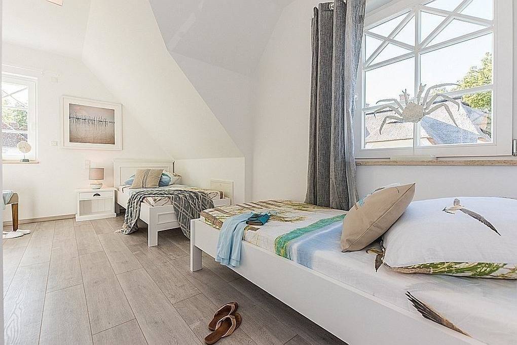 Im Erdgeschoss befindet sich ein Badezimmer, während im Obergeschoss zwei Schlafzimmer mit Boxspringbett (180x200 m) und zwei Einzelbetten bereitstehen. Eine gemütliche Galerie mit Hotelaufbettung (140x200 m) bietet zusätzlichen Schlafraum. Alle Schlafzimmer sind mit TV ausgestattet.
