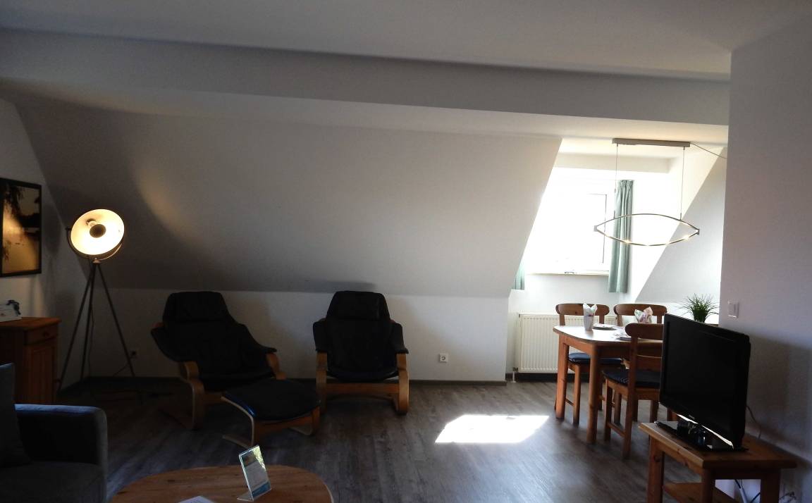 3 Zimmer-Maisonette ca. 75 qm für 2-6 Personen, Haus A in der Residenz Kormoran, Grüne Straße 45A-R, Ostseebad Prerow. 1.OG: Wohnzimmer mit Schlafcouch, Sitzgarnitur, Kleiderschrank, SAT-TV/Radio, WLAN, Duschbad/WC, Balkon, Essecke mit Küchenzeile (Spülmaschine). 2.OG: 2 Schlafzimmer, 1x Doppelbett, 1x 2 Einzelbetten, Dusche/WC
