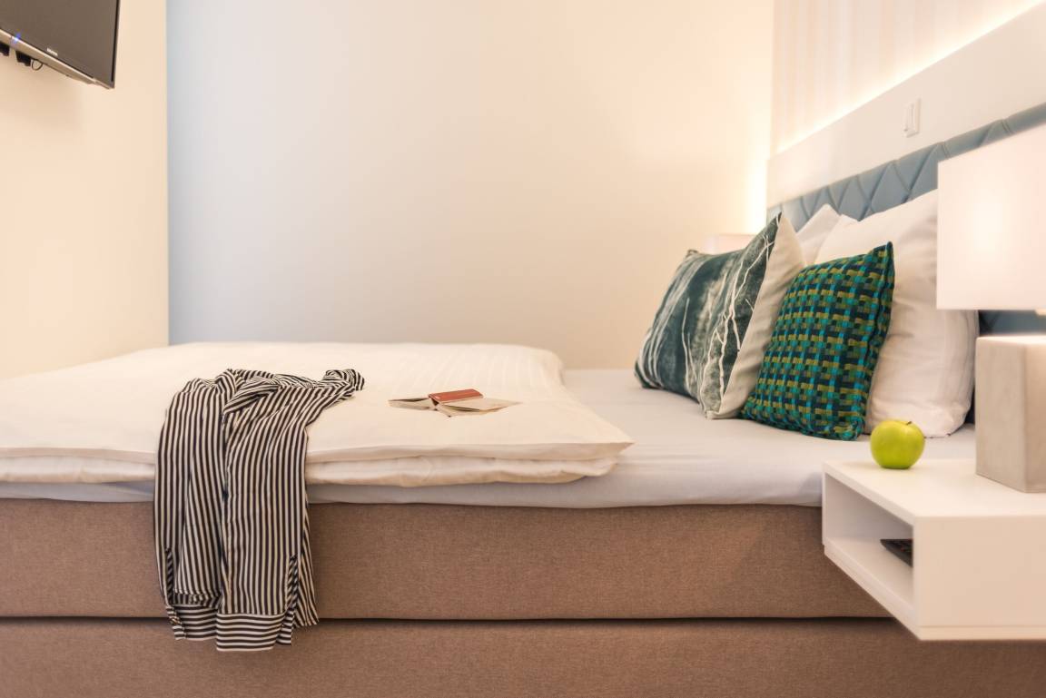 Der offen gestaltete Wohn- und Schlafbereich ist mit einem komfortablen Boxspring-Doppelbett sowie TV ausgestattet und verbindet Wohnen und Entspannen auf harmonische Weise. Der integrierte Essbereich und die moderne Küche bieten alles für eine unkomplizierte Selbstversorgung, darunter Backofen, Cerankochfeld, Geschirrspüler, Kaffeemaschine, Wasserkocher u.v.m.