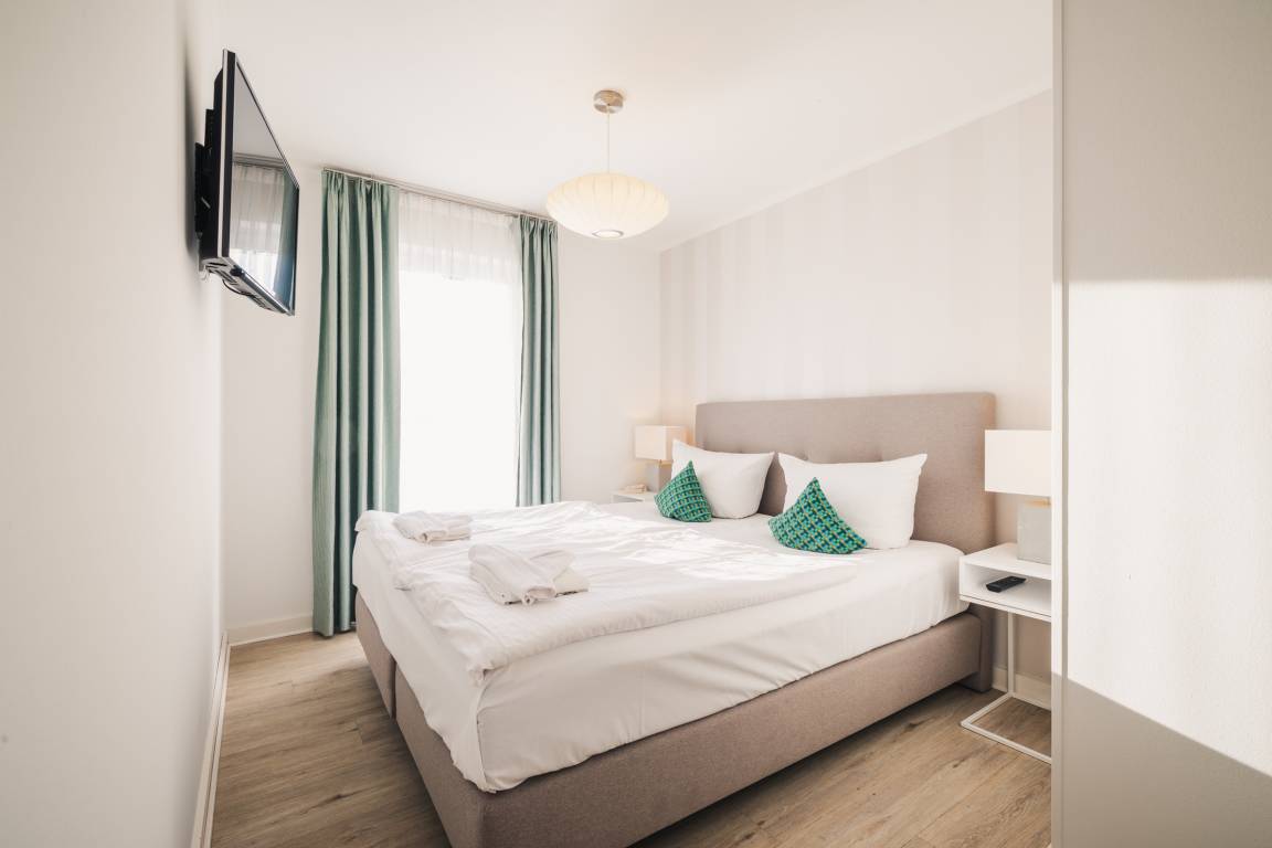 Zwei separate Schlafzimmer mit komfortablen Boxspring-Doppelbetten und TV sorgen für erholsame Nächte. Der großzügige Wohnbereich mit bequemer Couch und Flat-TV lädt zu gemütlichen Stunden und gemeinsamen Abenden ein.