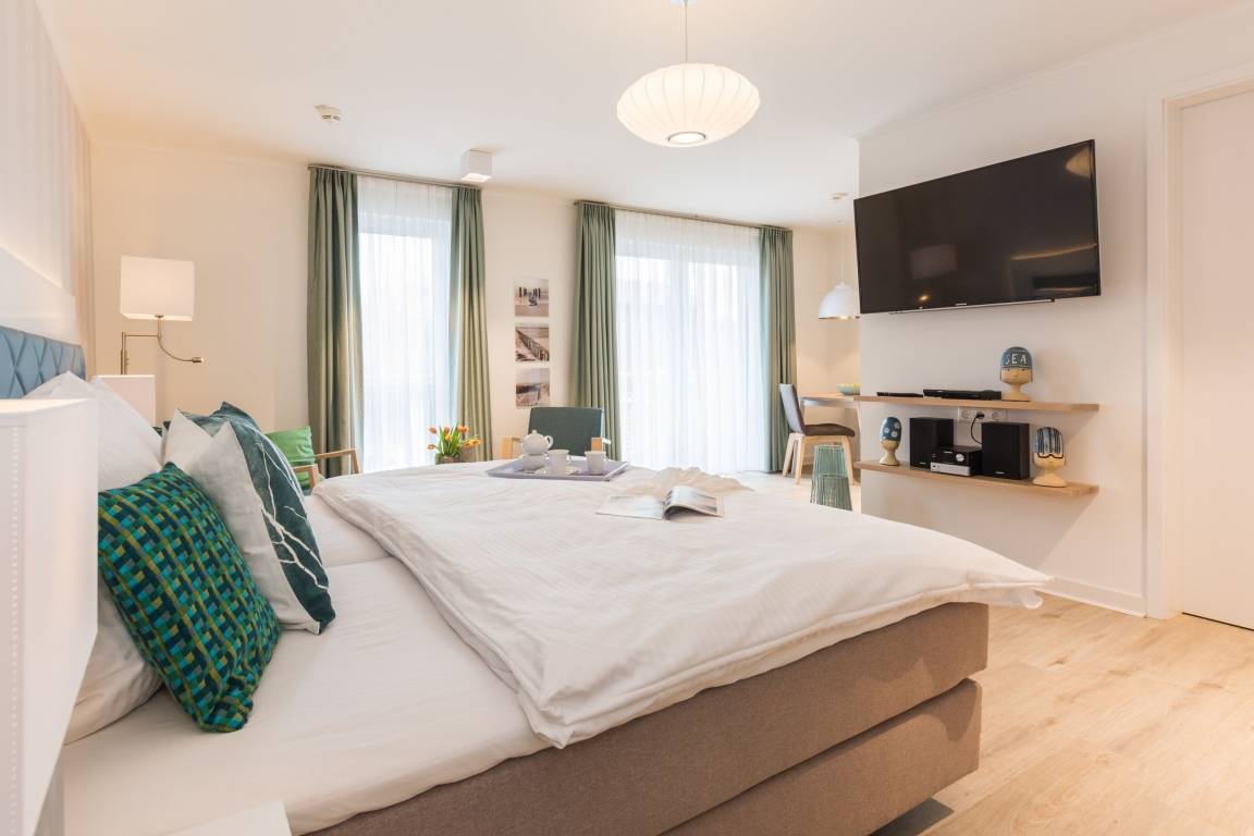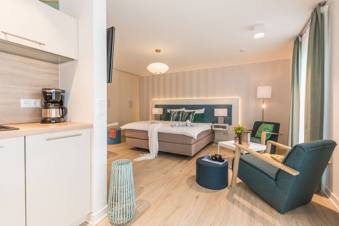 Der kombinierte Wohn- und Schlafbereich mit komfortablem Boxspring-Doppelbett lädt zu erholsamen Nächten und gemütlichen Abenden ein. In der kuscheligen Sitzecke genießen Sie gemeinsame Stunden – mit einem Buch, einem Glas Wein oder einfach nur mit Zeit füreinander.