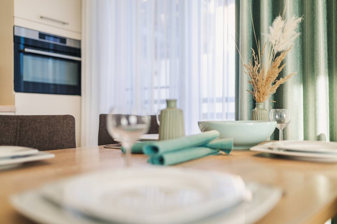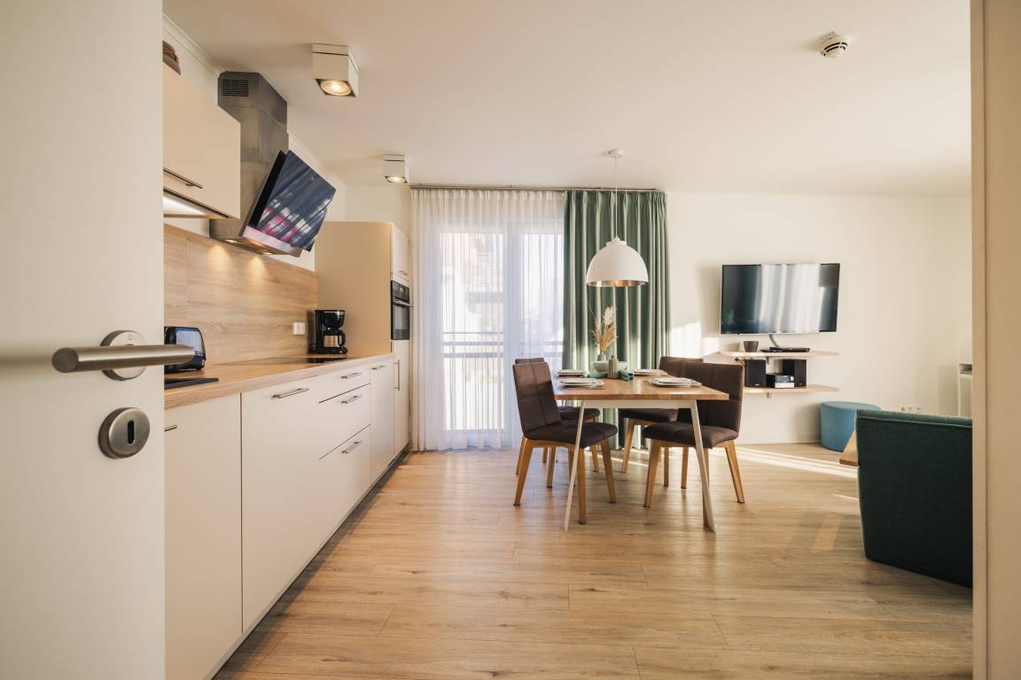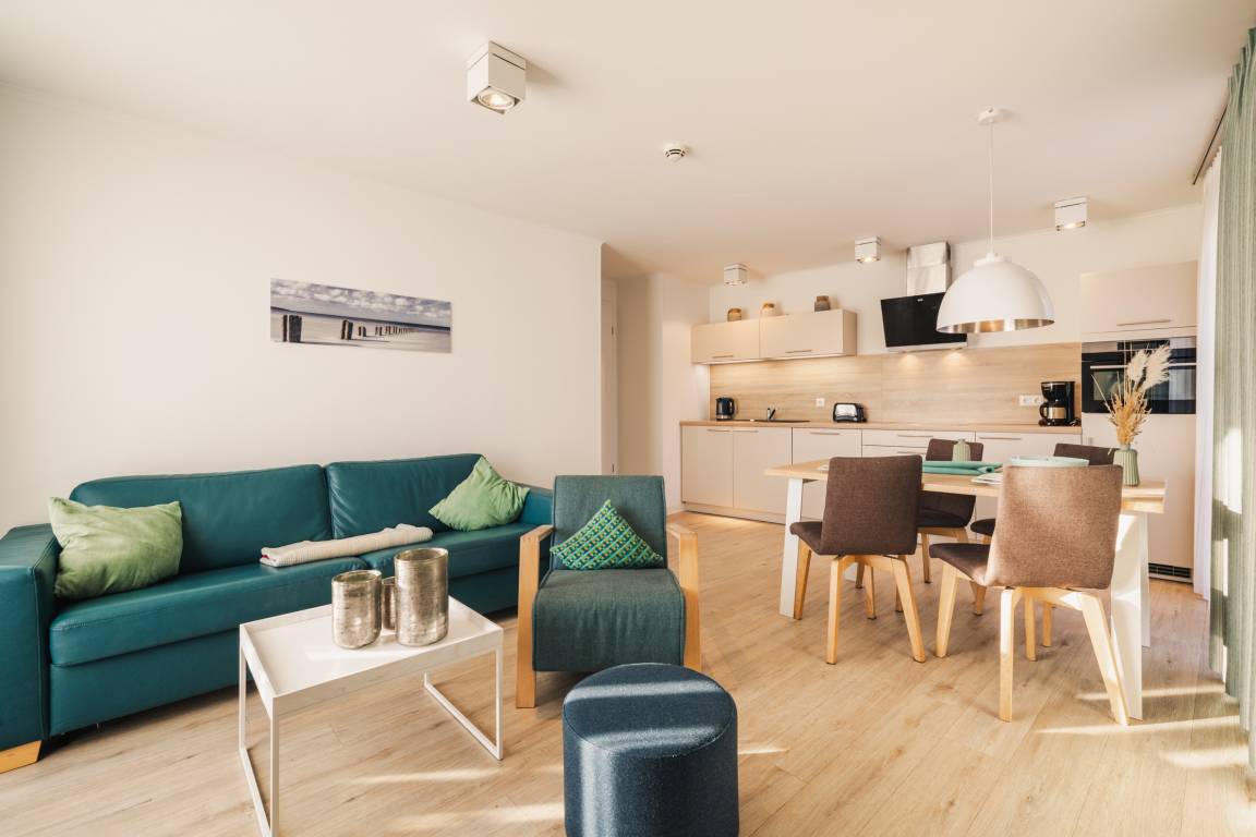 Die voll ausgestattete Küche verfügt über Spülmaschine, Backofen, Cerankochfeld, Toaster, Wasserkocher, Kaffeemaschine [&] Nespresso-Maschine und bietet alles, was Sie für eine flexible Selbstversorgung benötigen. Ein schöner Platz im Freien ist die private Terrasse, ideal für ein entspanntes Frühstück oder einen ruhigen Tagesausklang an der frischen Ostseeluft.