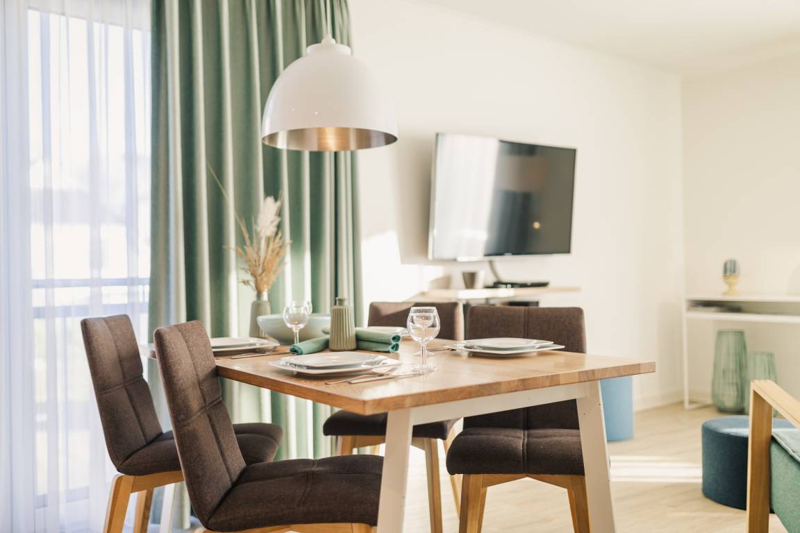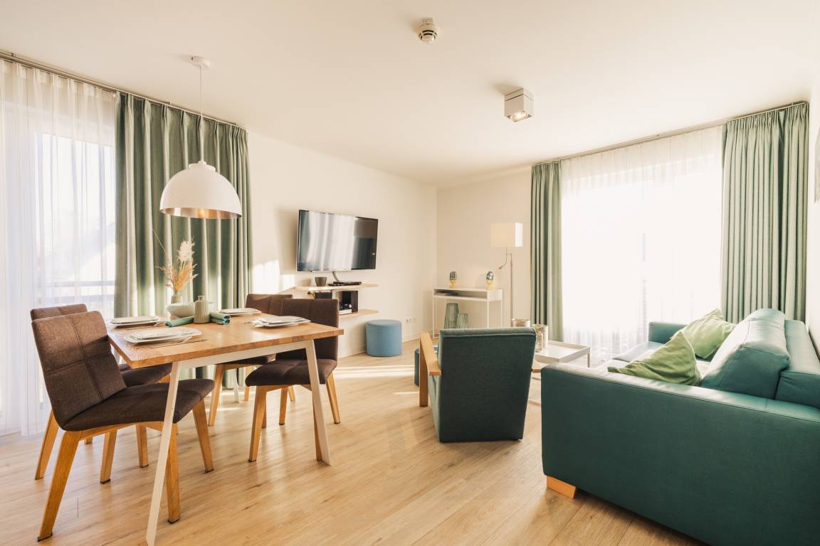Zwei separate Schlafzimmer mit komfortablen Boxspring-Doppelbetten und TV sorgen für ruhige Nächte. Der wohnlich gestaltete Aufenthaltsbereich mit großer Schlafcouch und Flat-TV lädt zu gemeinsamen Stunden und gemütlichen Abenden ein.