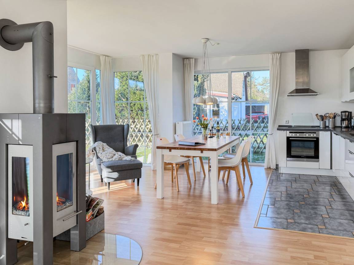 Die Ferienwohnung Bi de Wisch, EG empfängt Sie mit einer harmonischen Kombination aus modernem Komfort und gemütlichem Ambiente. Der helle Wohnbereich mit Kamin lädt zu entspannten Abenden ein, während die voll ausgestattete Küche keine Wünsche offenlässt. Genießen Sie Ihre Mahlzeiten auf der eigenen Terrasse oder im umzäunten Garten mit Strandkorb und Sonnenliegen. Die beiden Schlafzimmer sorgen für erholsamen Schlaf, und das moderne Badezimmer bietet zusätzlichen Komfort.