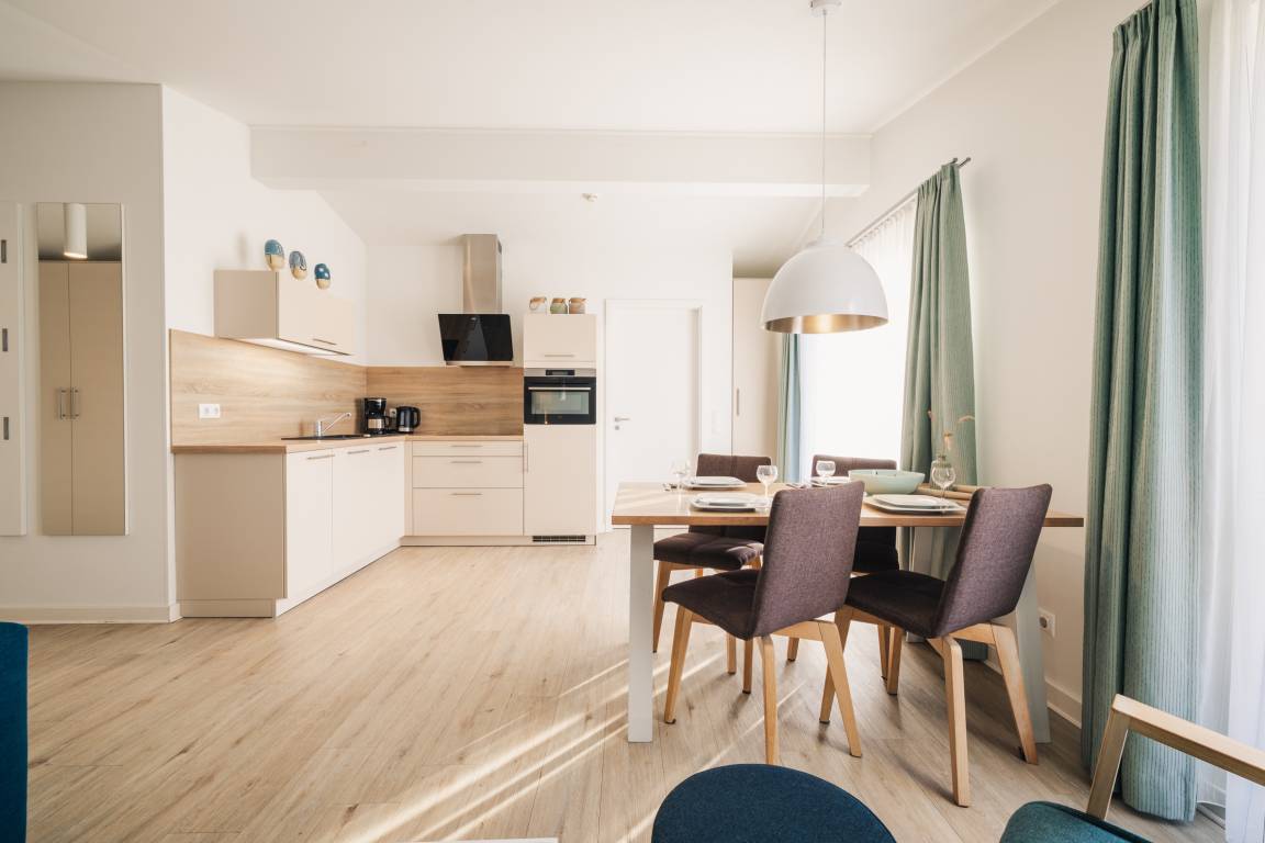 Der Essbereich geht harmonisch in die voll ausgestattete Küche über. Diese bietet Ihnen Backofen, Cerankochfeld, Geschirrspüler, Kaffeemaschine, Wasserkocher, Toaster u.v.m. – ideal für eine flexible und unkomplizierte Urlaubsgestaltung. Der Balkon ist ein schöner Ort, um den Tag an der frischen Ostseeluft ruhig ausklingen zu lassen.