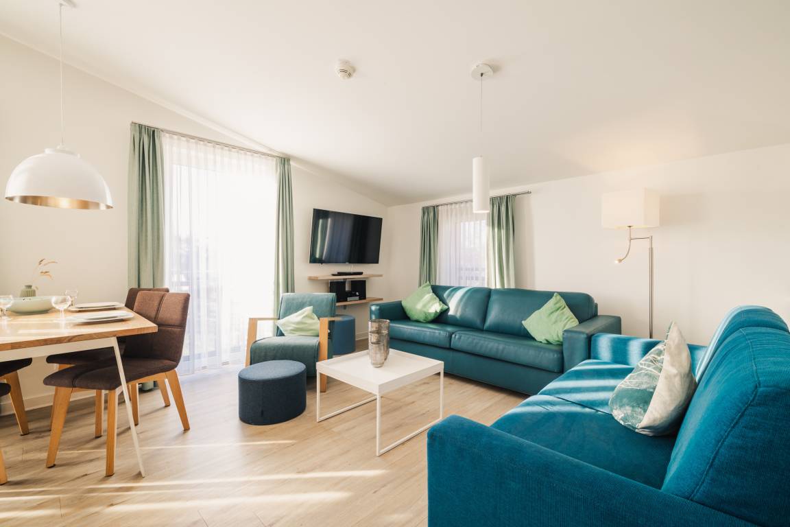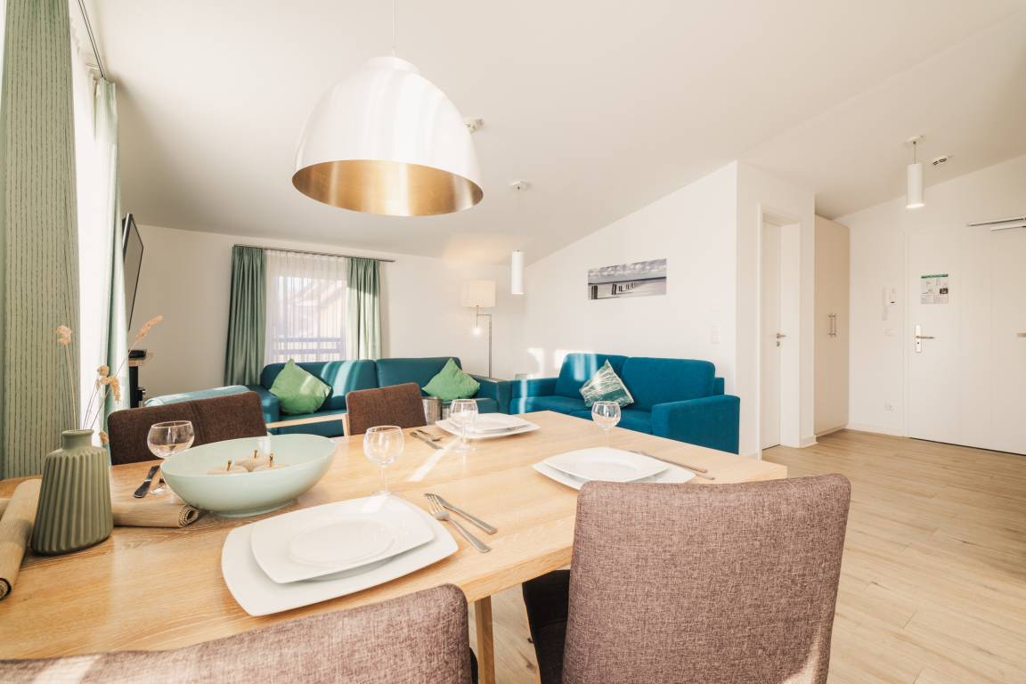 Dieses moderne 2-Zimmer-Appartement im Dachgeschoss bietet auf 48 m² Wohnfläche ausreichend Platz für bis zu vier Personen. Helle Räume, ein maritim inspiriertes Gestaltungskonzept und eine durchdachte Ausstattung schaffen eine angenehme Atmosphäre für einen entspannten Aufenthalt an der Ostsee.