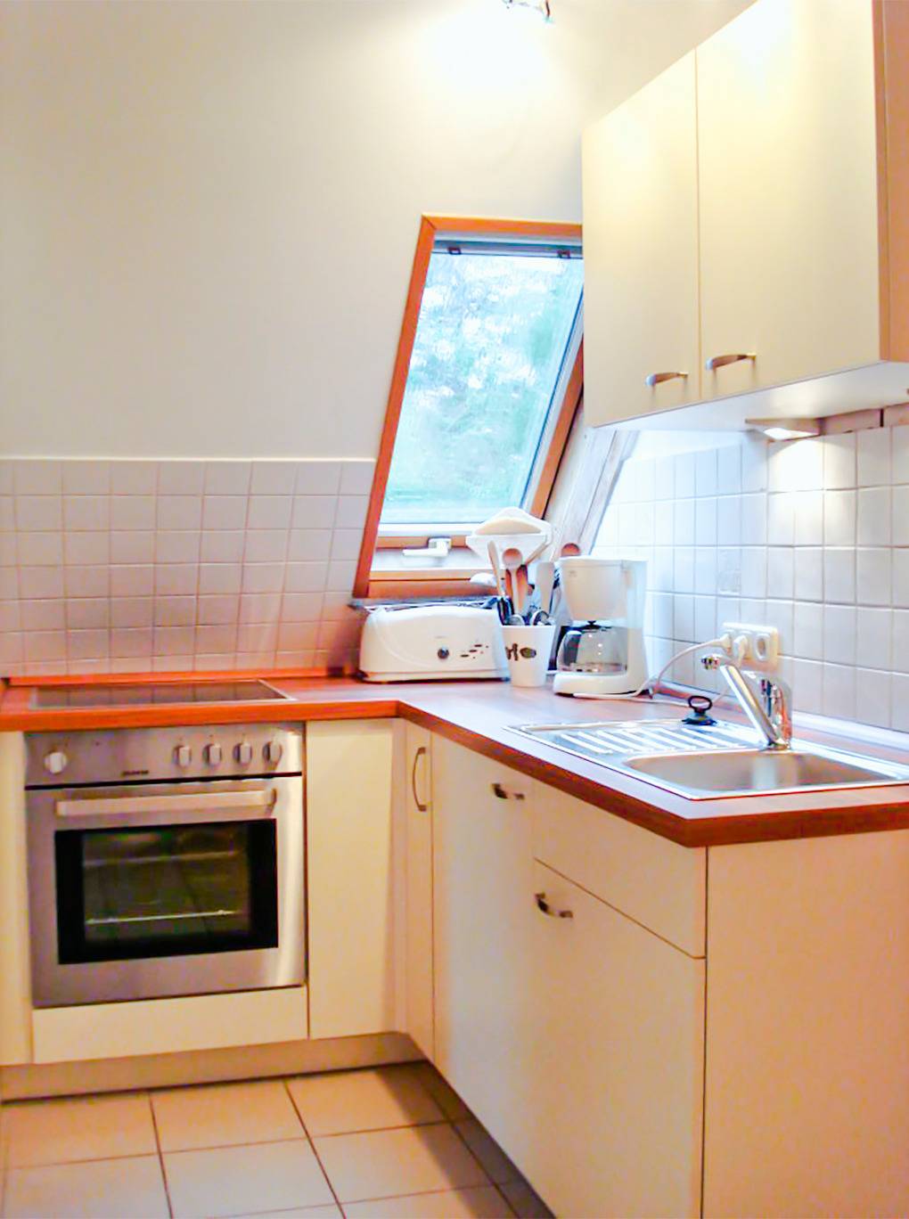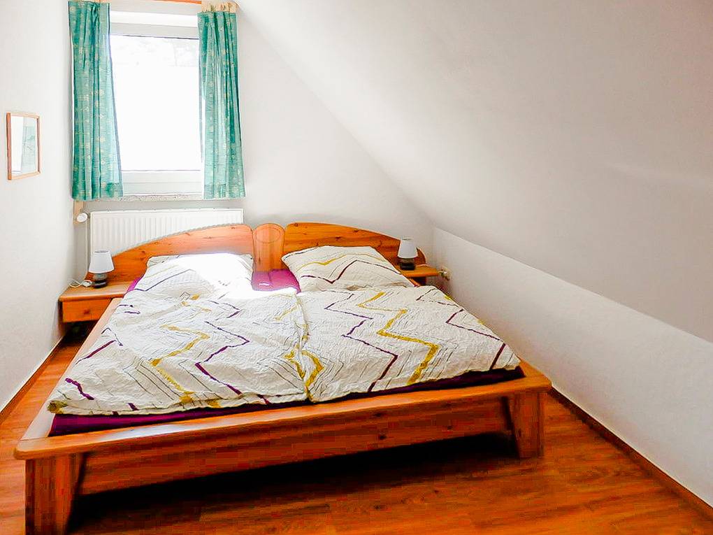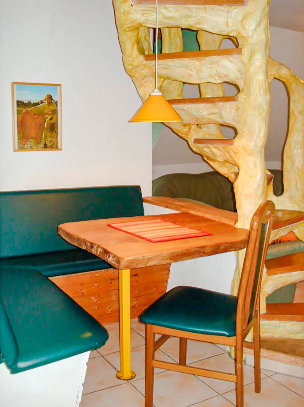 D 66.19 Wohnung 1-4 Pers.: 3-Zimmer-Maisonettewohnung, 47 qm Wohnfläche über 2 Etagen. 1. Etage: Wohn-/Essraum mit Couchgarnitur, kleine Essecke (Esstisch, Eckbank), Küchenzeile (Backofen). Doppelzimmer. Bad/WC. Steile Wendeltreppe in den offenen Spitzboden mit starken Dachschrägen (max. Stehhöhe 1,70 m): Doppelbett. Südbalkon.